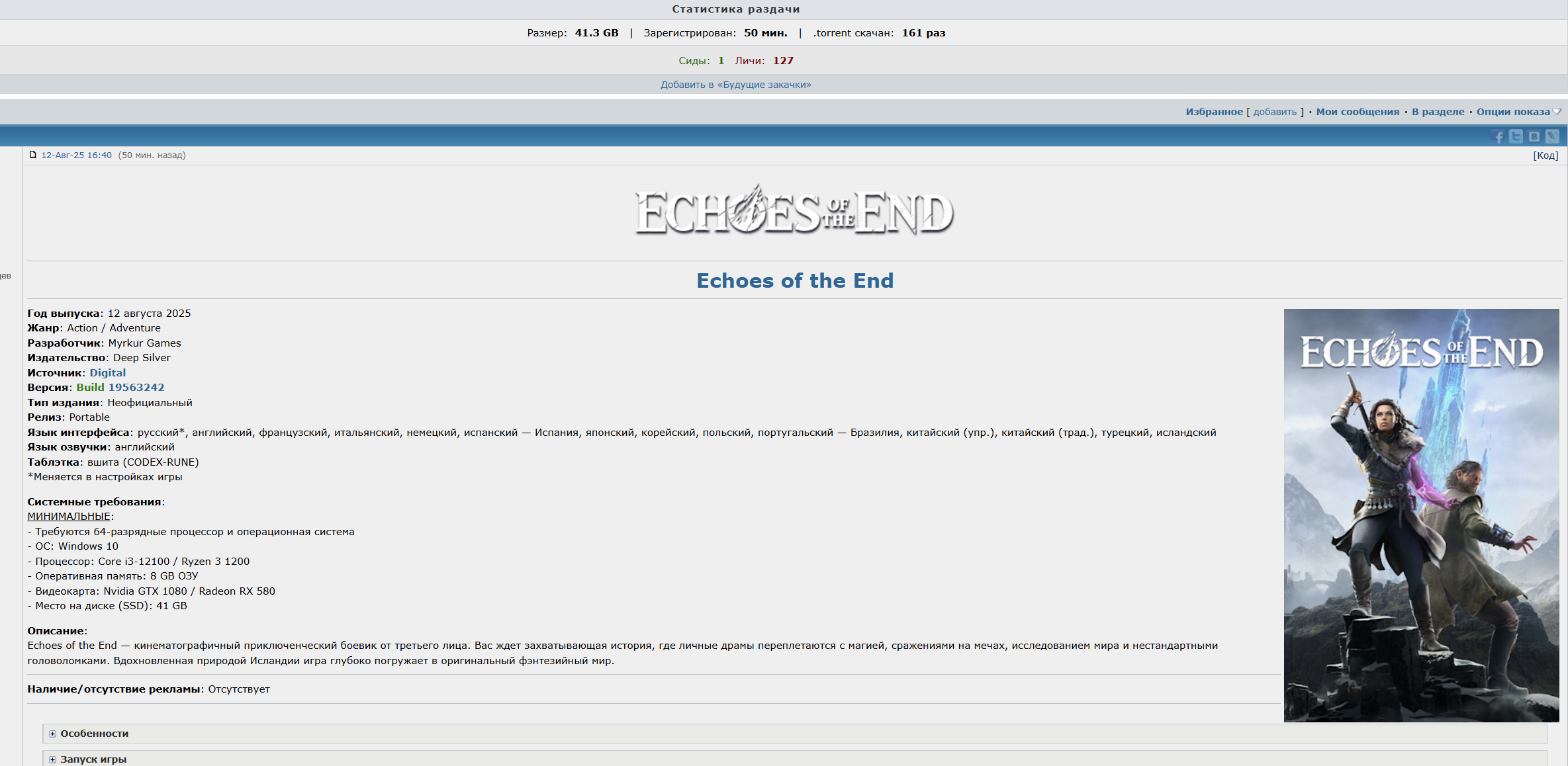 12 августа состоялся релиз Echoes of the End — приключенческого экшена от исландской студии Myrkur Games. Это дебютная работа команды, в которой трудятся около 40 человек, включая бывших сотрудников CCP Games, Ubisoft, Supermassive Games и Massive Entertainment.