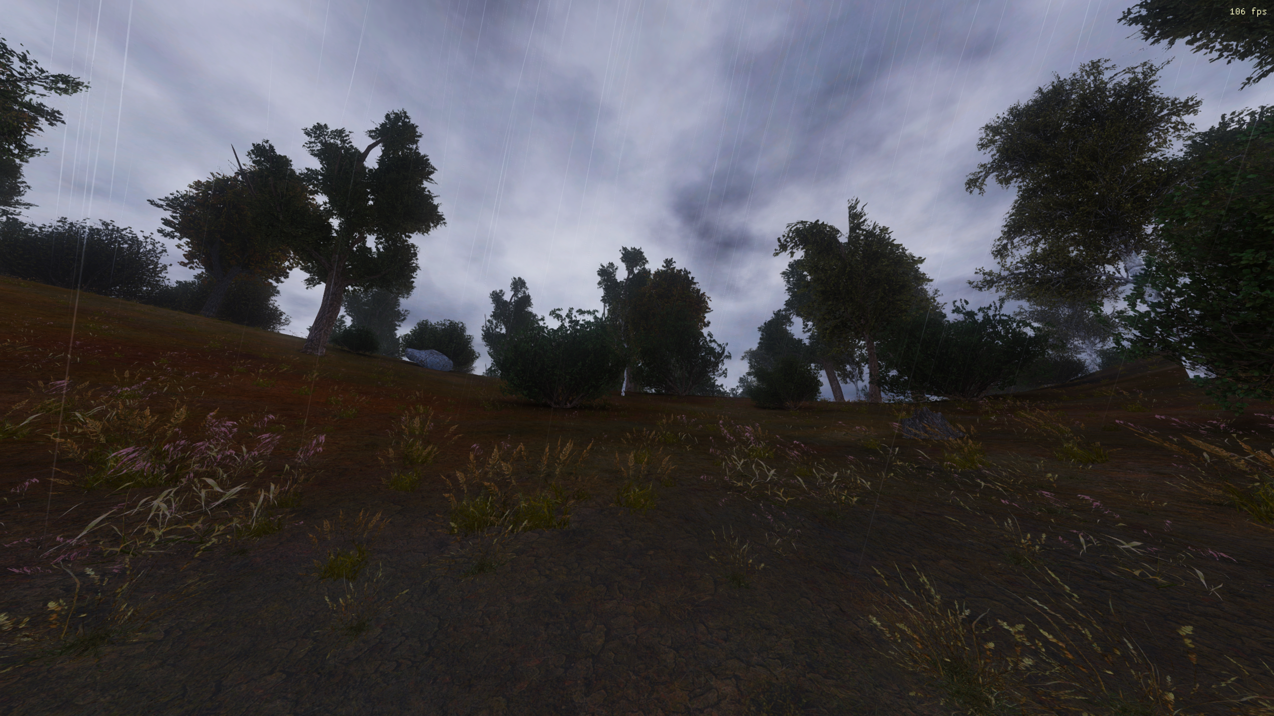 Подкрученные шейдеры - это хорошо, но фепес нестабильный вообще, пришлось скручивать настройки, а то когда падает до 40 играть просто анрил, какой-то ужасный инпут лаг появляется, жесть. Но выглядит прикольно, атмосферно, в дождик лужи, деревья качаются, туманчик стелется. Прикольно сделали локацию, во-первых, тут временная аномалия, так что время бежит быстрее, значит быстрее садится аккумулятор, фонарик, арты и Моченый Перченый жрет как не в себя. Врагов нет, вообще, зато аномалии, очень много хитрый плохо заметных телепортов, которые начинают швырять в рандомные места на карте. И самое главное - ПДА не работает, низзя поглядеть на карту, так что надо прям ориентироваться на местности. Прикольно, необычный экспириенс выходит.