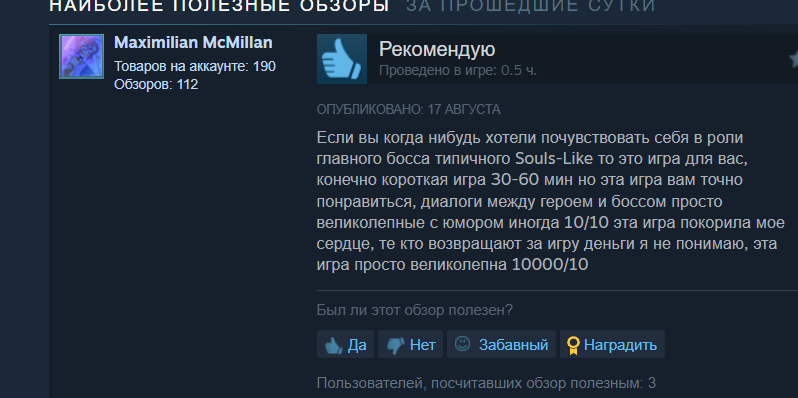 Рекомендую каждому поиграть в это 10 минут, а потом почитать отзывы. Мгновенно испарится заблуждение о том, что положительные оценки в стиме реально что-то значат.