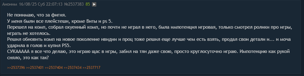 Итог - наносек, йоба пека (5080 4к ОЛЕД) и даже садиться за комп не охото, реально интереснее какой то сериал посмотреть или книгу почитать, чем какую то игру запускать. Вообще не во что не играю и 0 интереса уже ко всему этому.
