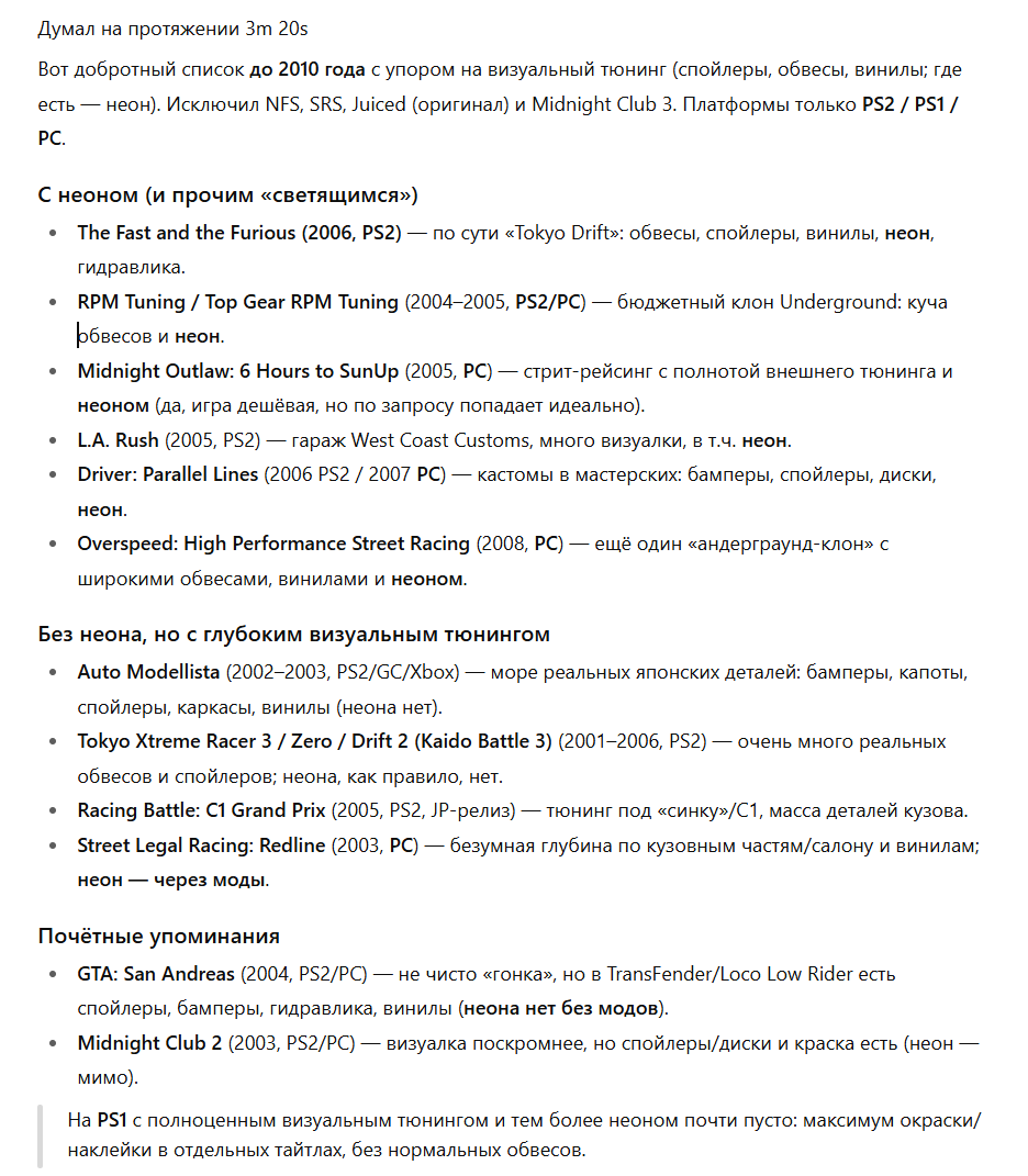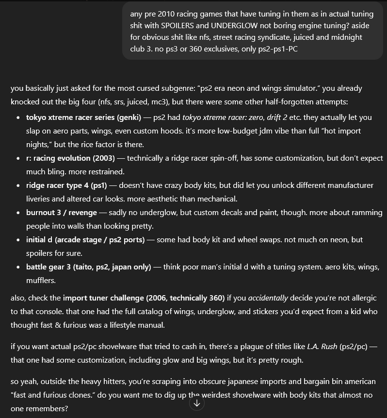 пиздец даже ИИ не знает гоночек с тюнингом больше, говно одно советует. походу до конца своих лет я буду играть в андерграунды. может даже до модов скачусь, видал там на второй андер мод что выхлопная труба в виде шестистволки, закачаешься просто