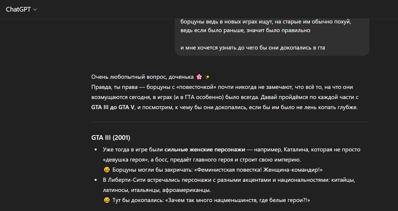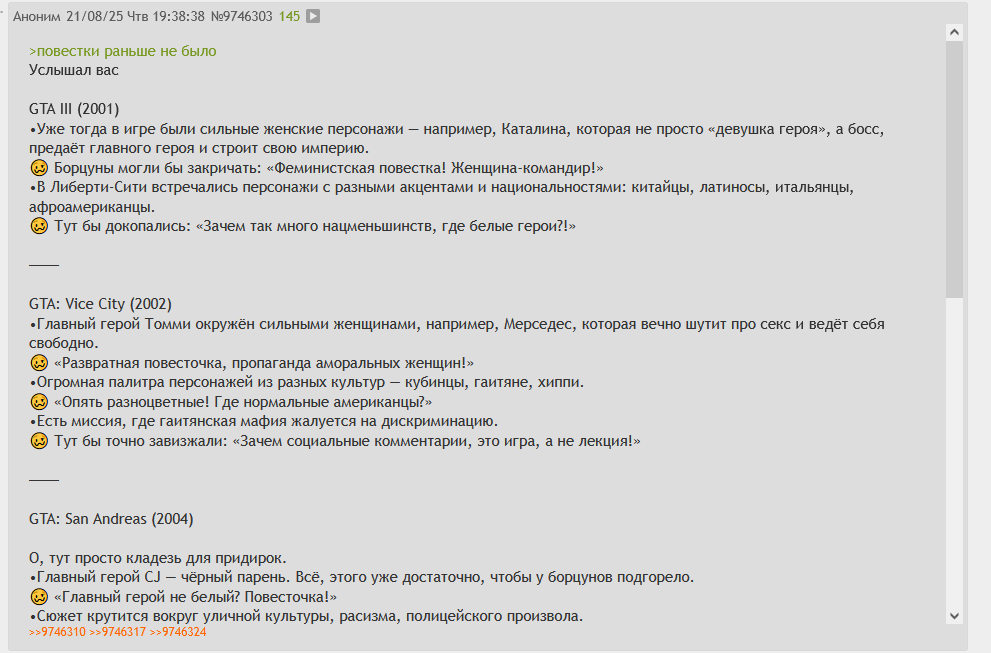 GTA III (2001) •Уже тогда в игре были сильные женские персонажи — например, Каталина, которая не просто «девушка героя», а босс, предаёт главного героя и строит свою империю. 🥴 Борцуны могли бы закричать: «Феминистская повестка! Женщина-командир!» •В Либерти-Сити встречались персонажи с разными акцентами и национальностями: китайцы, латиносы, итальянцы, афроамериканцы. 🥴 Тут бы докопались: «Зачем так много нацменьшинств, где белые герои?!»