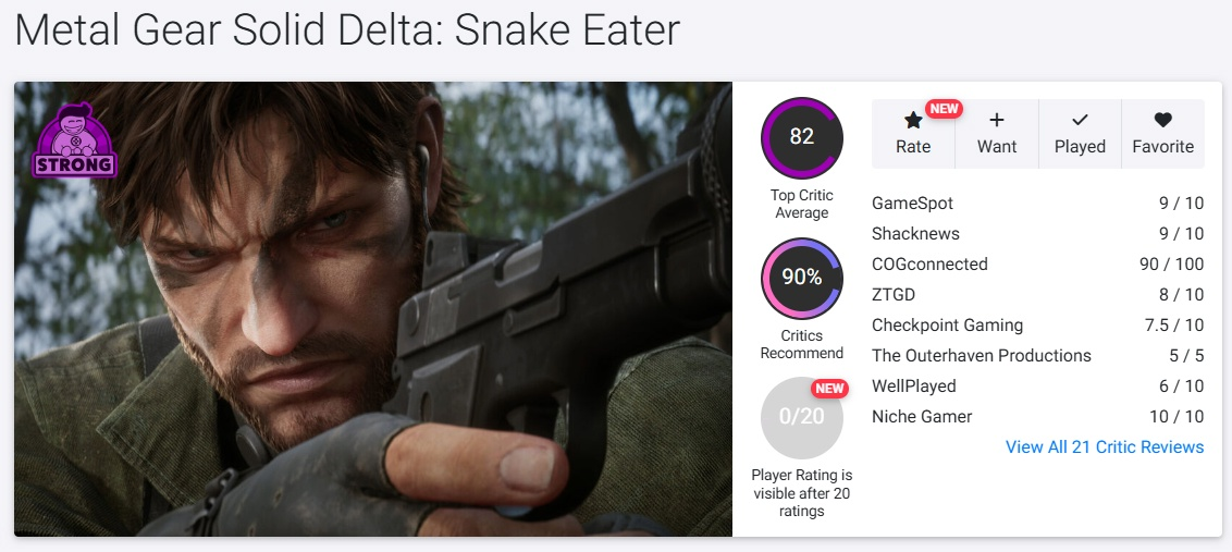 >22 августа СМИ опубликовали обзоры Metal Gear Solid Delta: Snake Eater — ремейка третьей и, вероятно, самой известной части серии. Обозреватели встретили игру положительно: её рейтинг на Metacritic составил 85 баллов, а на OpenCritic — 83 балла.