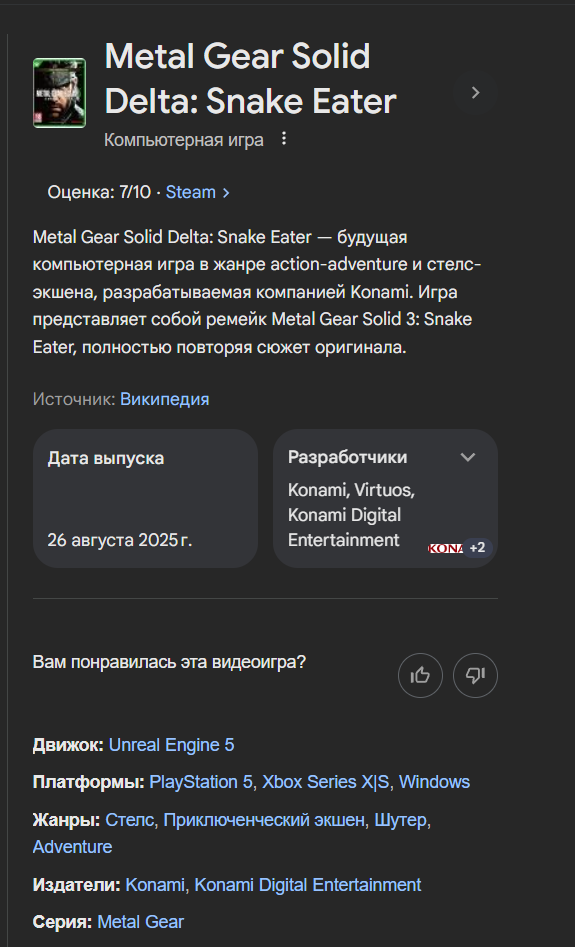 Прошёл мгс3 в пятый уже раз. Игра шедевр, это новое переиздание не очень. Новая камера не особо работает для старого геймплея потому что там был вид сверху и было видно где нпц, а тут они тебя палят за углами потому что расставлены с расчетом на старую камеру. Есть легаси режим, но он не по умолчанию, новая аудитория даже не знает что это игра 2004 года и сгорит с геймплея, он довольно серьёзно устарел. Ну это проёб конами, да и хуй с ними.
