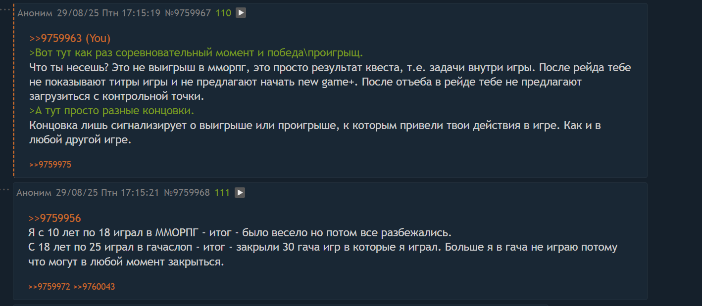 А является ли гачаслоп или ММОРПГ дрисня играми как таковыми? Что определяет игру и отличает ее от другого время провождения? Win condition и lose condition. В игре могут создаться условия, при которых ты ее выигрываешь и в нее проигрываешь. Видеоигра - подвид игр, которые симулируются на ЭВМ. Например, в визуальной новелле можно выиграть - пройти игру, или же проиграть - словить бэд энд. А как выиграть в гачаслопе? Как проиграть в ММОРПГ? Ну можно на рейде босса ебнуть или откиснуть там, но это не выигрыш и не проигрыш. Т.е. визуальные новеллы это больше игры чем вов и гача, которые не игры вовсе, а просто виртуальное бесцельное времяпровождение.