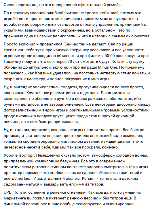 Я специально не проходил ни один ГТА, Метал Гир, ДМС, Деус Экс, Принц оф Пержа, винчики от Аркейн, Гад оф Вор, Драгон Ейдж Ориджин, Персону, Сайлент Хилл, Резидент евил, Дед Спейс, Планскейп Торр Мент и много чего еще, потому что коплю на черный день. Когда игр не будет совсем. Наверняка немалая часть из этого окажется говняком, но что-то может и зайти. А если щас все перепройти, то где потом брать игры, новых-то нет. Сеймы есть?