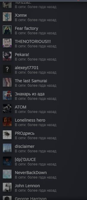 >>9765048 У меня никогда не было друзей. В стиме какие-то рандомы которые после каток в онлайн игры добавляли и я с ними никогда не играл и не контактировал. Все живы