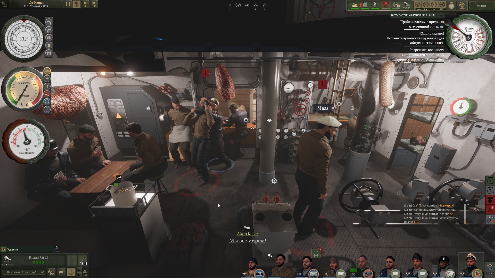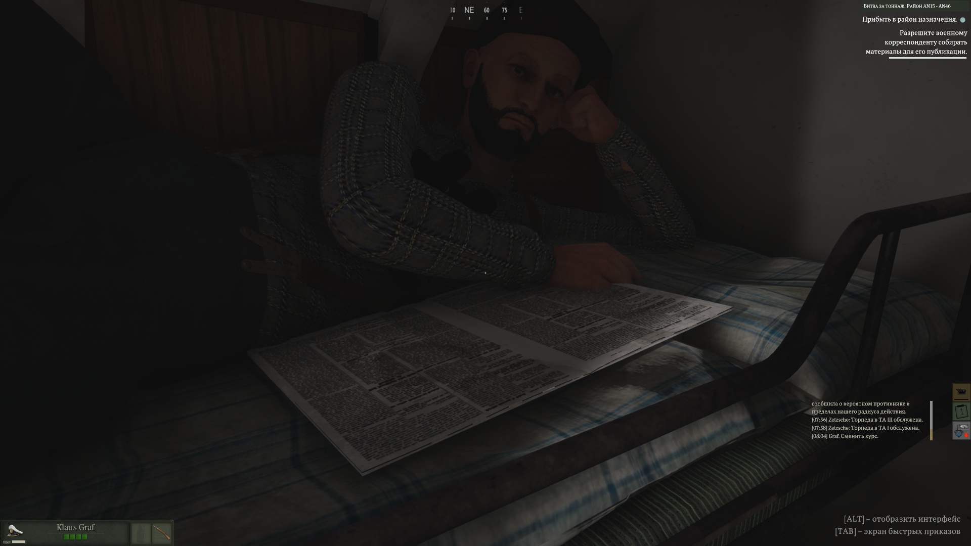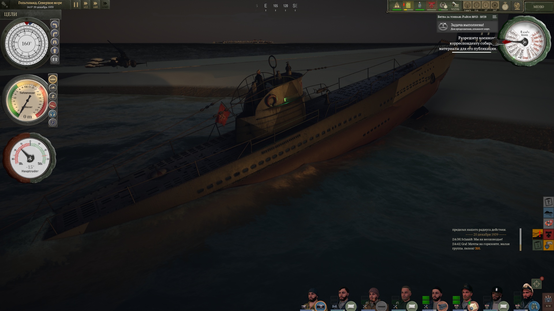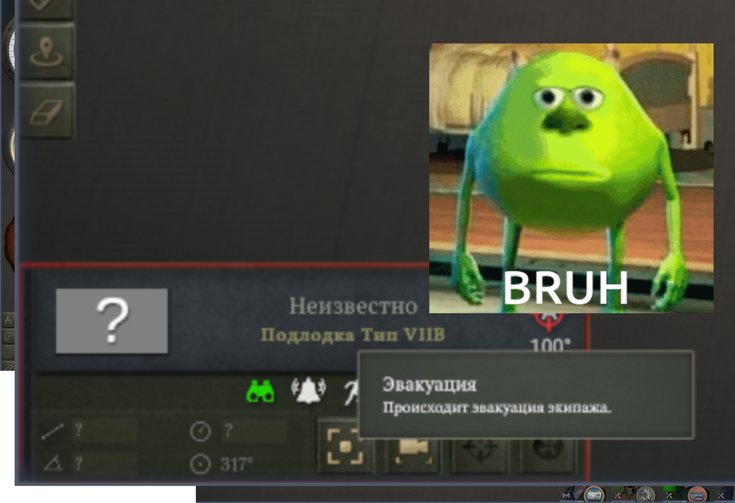 Капитан нахуярился и выпал из рубки, едва спасли. Тупо стоял там с задачей наблюдение, пока не вырубился, не выпал и не стал сползать с корпуса. Помню, как 20мм зениткой обмазывал грузовое судно, чтобы лишнюю торпеду не тратить, и там из окон иногда так же кто-то падал. Ускорение времени не вписывается в повороты. Постоянно выбрасывает то на мель, то на бортики причала, а торпеды возле корпуса лодки взрываются, если пускать с ускорением, как будто в стену невидимую вмазываются. Особенно с замороченным причалом Гильгалада плохо. И меня заебал военный корреспондент. 2 недели наверно в море был, все задачи выполнены, торпед нет, половина команды сошла с ума, у другой туберкулез, из жратвы только сушеный картофель тухлое. А ему всё мало материала для статьи. Он даже вопросы не задает, это какой-то баг, просто шкала еле полез. Но я хочу жирную репутацию за миссию. Больше журналюг не беру.
