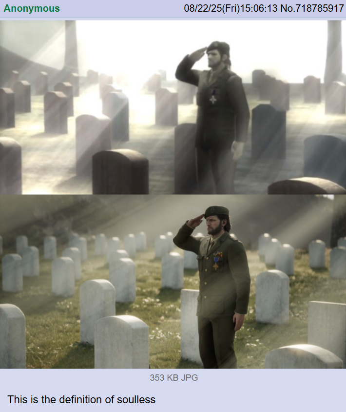 >>9786889 Картинка кстати пиздец жирная, выбрали самую ебланскую hd версию где весь графон зачем то кончёй залили и рассказывают как там художественно весь задник спрятали чтобы ничего не видно было а ремастер душу проебал, но ведь один хуй никто в оригинал не играл и не знает да и я не знаю, у других блохиров подглядел главное набросить