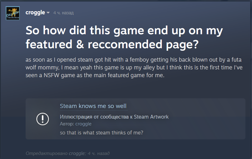 >>9790779 Ну я не удивлен, что фанату мгс это понравилось >А ты зачем зашёл? Да я на steamdb увидел, видел еще некоторым прям при запуске стима фембой в ебало прилетает, рофлс