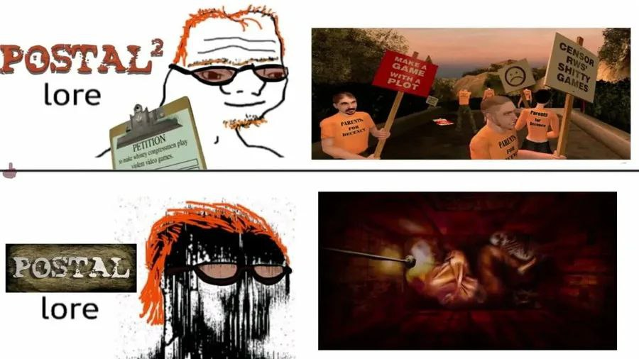На сколько я понимаю в первом постале такой лор, что главный герой ебанутый, который думает, что на землю напали демоны и все люди ему видятся демонами, поэтому он всех убивает. Странно, что никто не снял фильм с таким сюжетом. Выглядит перспективно.