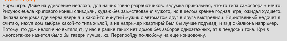 >>9809699 (OP) Норм игра. Даже на удивление неплохо, для наших говно разработчиков. Задумка прикольная, что-то типа самосбора + нечто. Рисунок ебала крипового конеш спиздили, кудаж без заимствования чужого, но в целом крайне годная игра, ожидал худшего. Выпала концовка где через дверь я и какой-то ёбнутый мужик с автоматом друг в друга выстрелили. Единственный недочёт я считаю, нахуя дом выбран какой-то типа жилой, а не например квартира? Был бы лучше подъезд, и вид с балкона например. Потому что дом нелогично выглядит, у нас в рашке таких нет домов без заборов одноэтажных, эт в пендосии тока. Крч в многоэтажке кажется было бы гаверн лучше, хз. Перепройду по-любому на ещё концовочку.