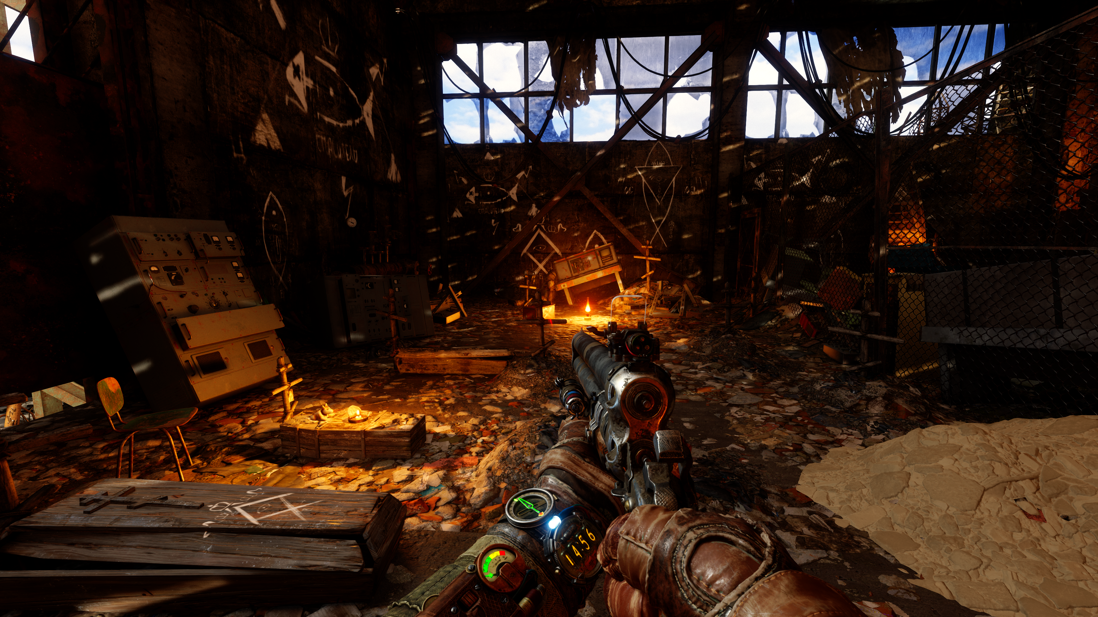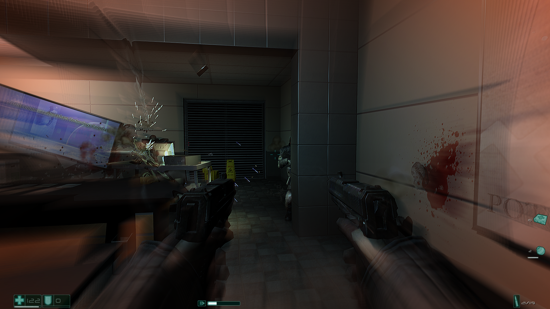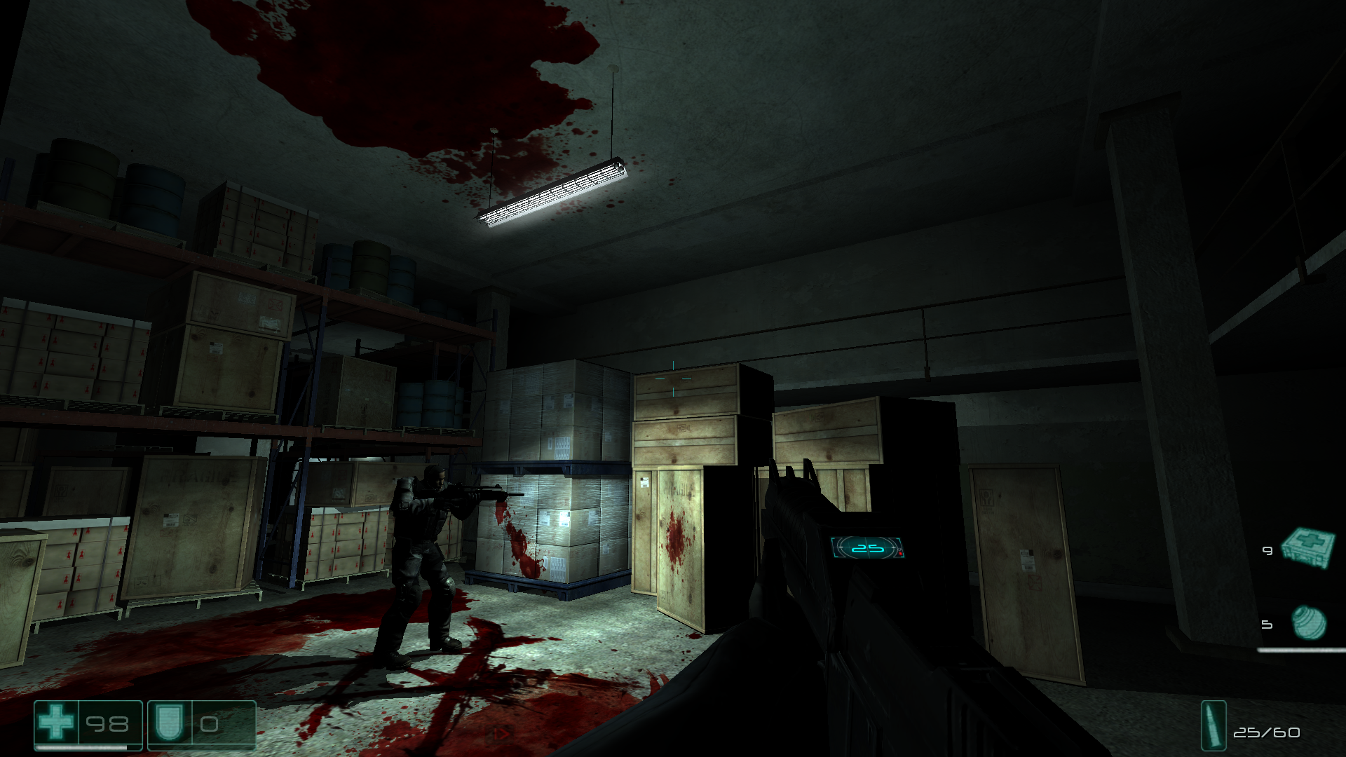 Да, при ближайшем рассмотрении видна и устаревшая графика и простенькие локации, но в бою этого не замечаешь. И по сути вся игра это переход из одной маленькой арены в другую, где тебя уже ждет 2-5 вражин с автоматами. Сожрать, повторить. Все это приправлено охуенным динамическим освещением (забытые технологии древних), отличным ганплеем и умным ИИ, который вполне может дать просраться. Болванчики не стесняются фланговать, выкуривать тебя гранатами, ведут огонь на подавление, не спешат сами лезть под пули и ловко уходят из под обстрела, типа “переговариваются” по рации, а еще забавно вопят и матерятся, когда на них самих выходишь из-за угла.