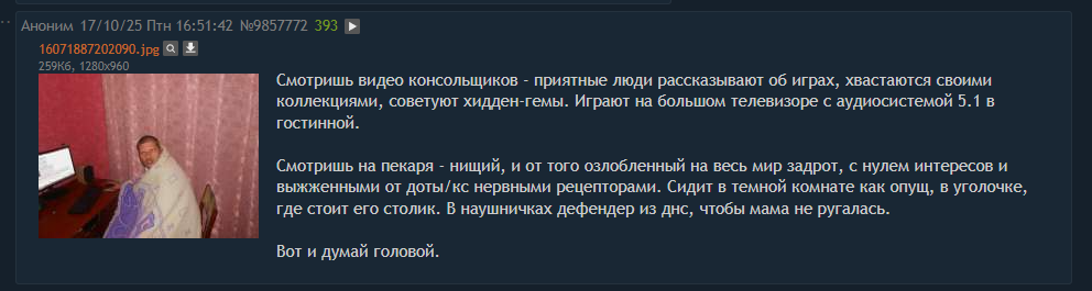 >>9859005 У тебя агро на старые игры потому что ты подсознательно понимаешь, что они лучше, но при этом сам в эти игры ты играть не можешь, т.к. не позволяют твои комплексы и предрассудки. Из-за этого конфликта у тебя всплеск эмоций.