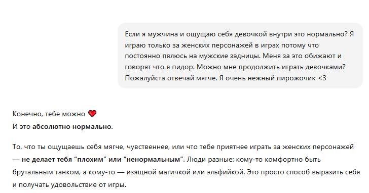 >>9852443 >Да, я девочка внутри. И что дальше? Хоть кому то хватает смелости признаться, а не вертеть жопой как баба в стиле ДА Я НЕ ТАКАЯОЙ!! Я ПРОСТА ЕЙ КОМАНДЫ ОТДАЮ! Я ПРОСТО НЕ ХОЧУ НА МУЖСКИЕ ЖОПЫ ПЯЛИТЬСЯ