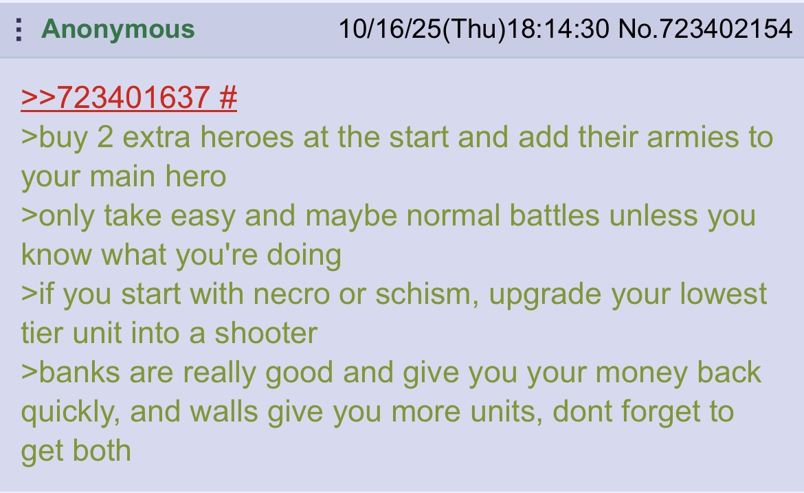 >>9866797 >с одной расой будут играть разными армиями >Речь про серию героев Герои тебе не варкрафт, тут нет выбора между вариантами "построить 50 домиков которые дают юнит тир 1 и зарашить ими" или "30 домиков для юнит тир 1 в качестве основной армии и 20 домиков для юнит тир 2-3 для спокойной игры в мид гейме" Ты можешь сделать армии не больше ограничителя в неделю, поэтому твоя цель не проебаться с экономикой в начале чтобы начиная с мид геймпа выкупать всех и доставлять армию к мейн персу Отличие имеет только некр с его воскрешением, но и то не сильное Олден эра хотяб немного меняет эту формулу в виде законов - ты можешь выбрать прирост каких юнитов будет сильнее и отталкиваться от этого, но база там всё равно таже Чел, тут люди в трёшке на разных "рассах" по одной и той же стратегии играют, какие нахуй разные армии для одной рассы