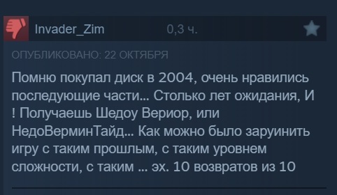 >>9868664 Так в отзывах абсолютно невменяемый дегенеративные утки. Игра - кооп шутер. >РРРРРЯЯЯЯЯ А ПОЧЕМУ НЕ СОЛА А ПАЧИЕМУ НЕКАК В ДЕТСВЕ Я ВАС СПРАШЕВАЮ???? Это буквально все отзывы, каждый, блять, отзыв такой. У игры, для которой было демо, каждый ёбаный отзыв - ачё гемплей другой чтолли??7ну не энта рефанд..