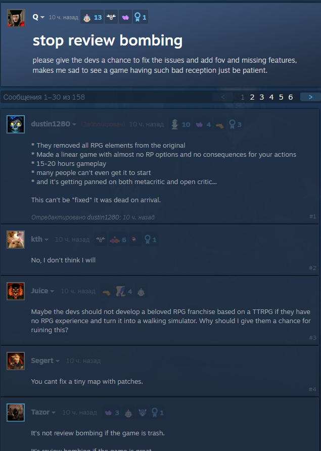 Что я понял из всех комментариев про игру: у огромного количества людей присутствует синдром утенка в терминальной стадии. Они не ждали новую игру, они ждали старую игру с текстурами 4к. Иначе эти визги про не так, как в первой части, хотя первой является вообще редемпшен, я объяснить не могу. Потому что игра не обязана копировать старую, изначально это вообще должно было быть ммо, от идеи о котором, кстати, точно также ныли, потому что не оригинал, а какая-то ммо. А ведь ммо была бы охуительной, потому что это и есть суть настолки - пиздеть с кучкой таких же шизиков как ты, воображая себя персонажем из мира придуманной вселенной. При этом сюжетно новая игра выглядит буквально как игровая сессия настолки для прохождения по вечерам после работы, опуская при этом ненужные вне настольных игр элементы типо бросков кубиков и листа характеристик. Возможно, дело еще в том, что так всех промыли серийные игры типо гта, где из части в часть одна игромеханика, меняются только персонажи и все. Читать эти тексты невозможно без кринжа, аудитория сама себя изжила и ограничила рамками скудного воображения, где шаг в лево и шаг в право уже выглядит как непоправимый ужас.