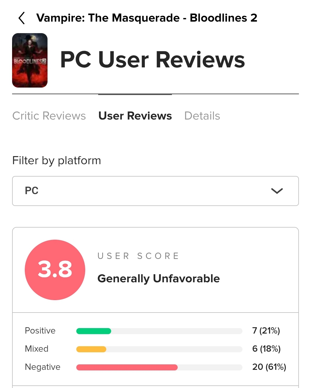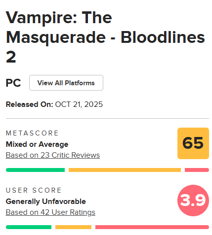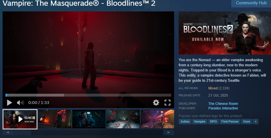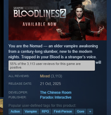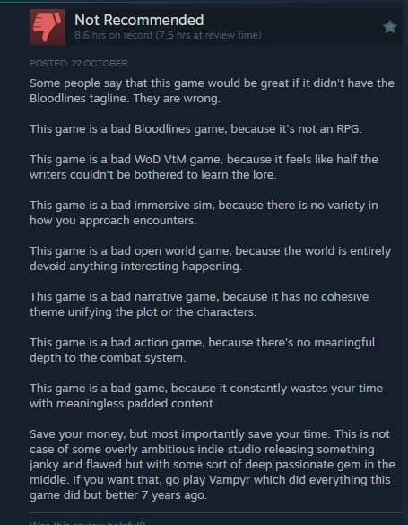 Прошел где то пол игры уже, ну что могу сказать... Это вылитая Абоба но в сеттинге мира тьмы или вампиров или как он там называется не шарю. Короче говоря на один раз пройти игру если прям совсем нравится вампирская тема и первая часть, в остальном реально Абоба же нахуй. Как будто один штат жирух нанимают на все нахуй "рпг" в кавычках нахуй игры. Жду еще аутер ворлдс 2, но скорее всего это то же будет очередной Абобой в сеттинге космоса.