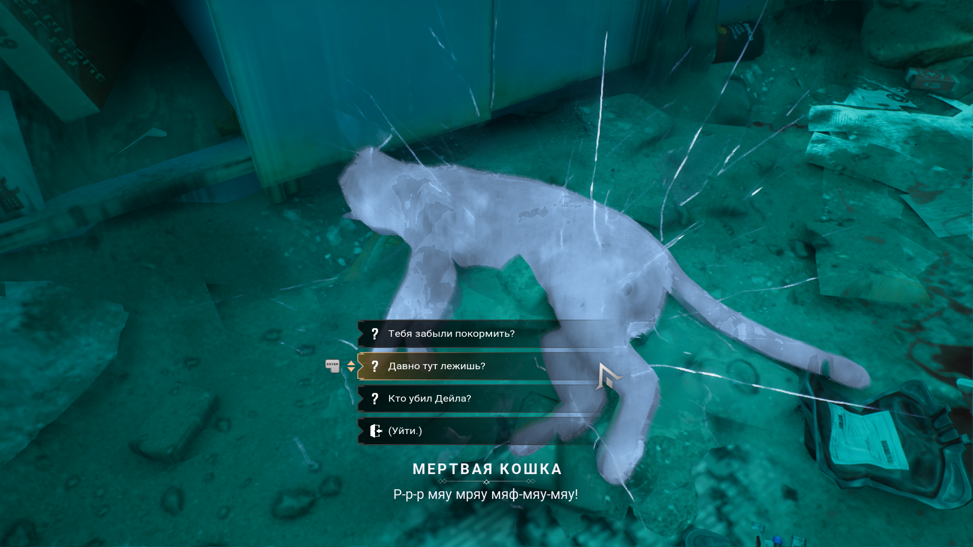Всего одна фраза знаку стоп. Не зачет. Поговорить с мертвым котом. Зачет. Итого имеется соевый малкавианин на гг ебущий всем в округ мозги в том числе и читающему его охуительные бредни игроку.