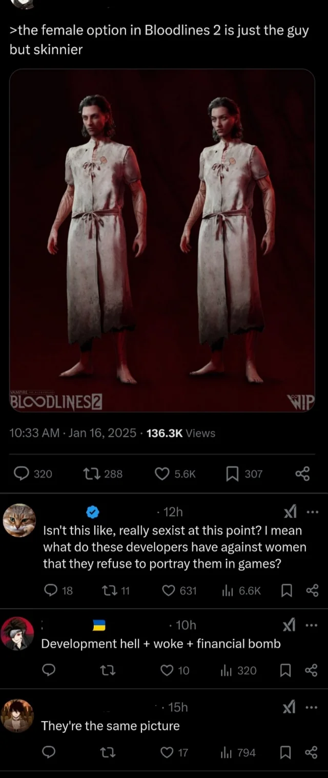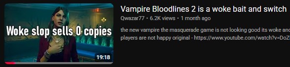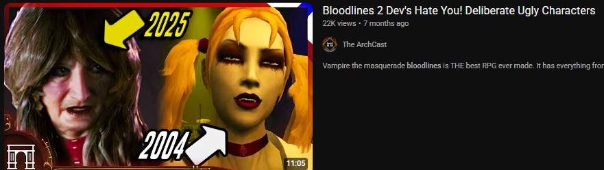 >нет системы человечности, можно убивать невинных без наказания, нет ярости, нет зверя >нет настоящей системы маскарада, где последующие нарушения приводят к появлению все более опасных охотников на вампиров, пока тебя неизбежно не казнит камарилья, нарушил один раз — и тебя мгновенно убивает магический телепортирующийся охотник, который пронзает тебя сзади, и это невозможно предотвратить >нет инвентаря, одежда чисто косметическая, нет оружия, нет характеристик, нет взлома замков, нет проверок речевых скиллов, нет взлома, ничего >примитивный бой, но враги только люди, люди с клыками или голые люди без глаз, нет Цимисхи уродцев, нет зомби, нет оборотней, нет куэй-цзин, гаргулий, шовельхедов, хенгекоя >клан ничего не значит, можно прокачиваться в дисциплинах любых кланов, все способности открываются ко второму часу игры >нет ролевой игры, нельзя быть злым ВАМПИРОМ >нет запоминающихся локаций или персонажей, о которых будут говорить еще через 20 лет >уебан5 >5+ лет разработки >6 часов прохождения >60$ Ну зато жирухи на разрабах не забыли добавить повесточку, ведь для них куда важнее ублажить Ларри Финка и его друзей, чем ориентироваться на игроков. Вот поэтому это говно и проталкивают в геймдев.