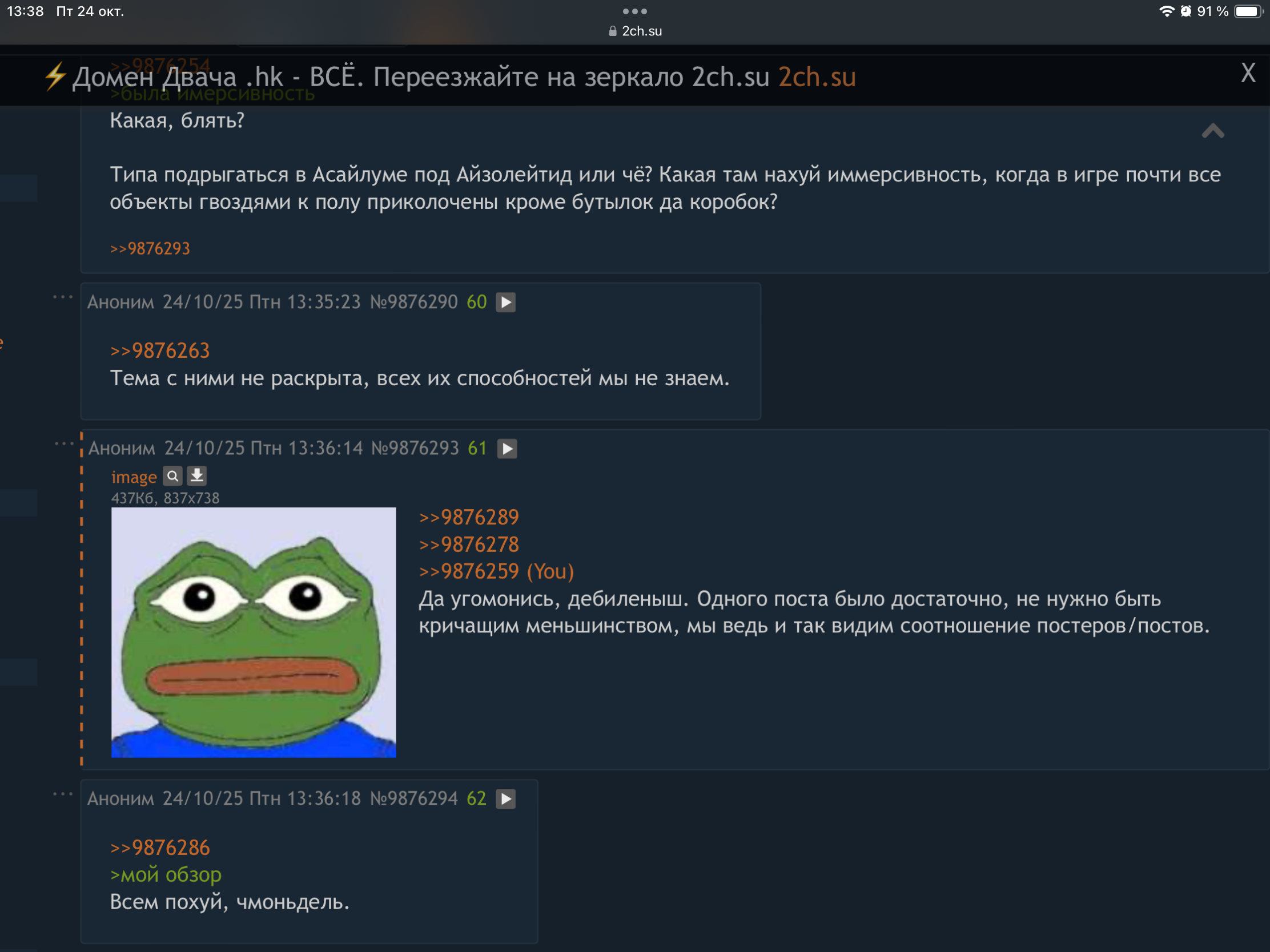 Сидели, обсуждали нормально первую часть, вторую часть. Пришёл один дегенерат, который срёт утками и тем, что вторая часть лучше просто потому что — и всё, пиздец. Тред умер, адекватные, обсуждающие ранее игру в треде, тред покинули или покидают.