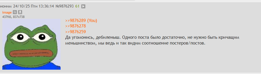 >>9876289 >>9876278 >>9876259 Да угомонись, дебиленыш. Одного поста было достаточно, не нужно быть кричащим меньшинством, мы ведь и так видим соотношение постеров/постов.