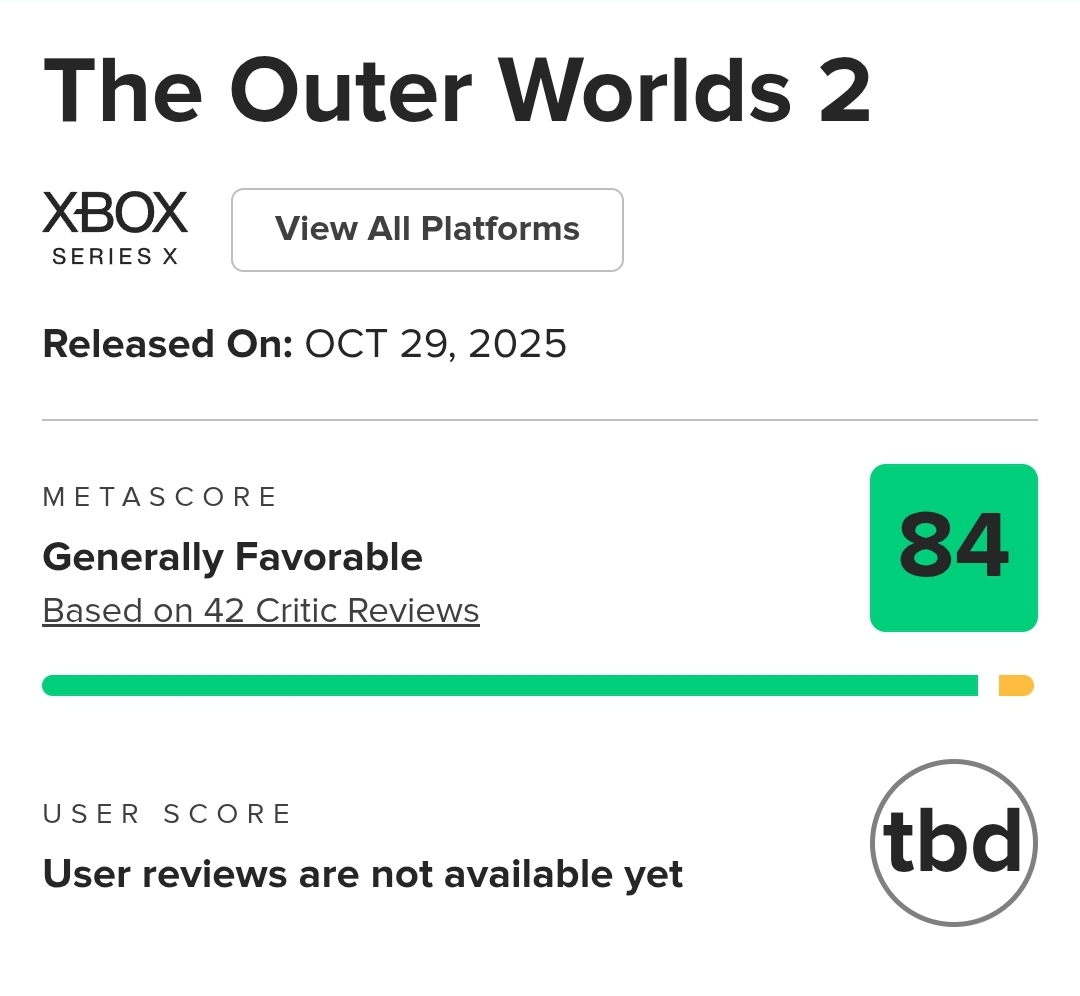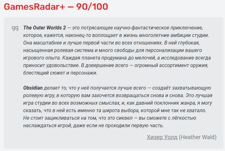 Рецензенты сходятся во мнении, что The Outer Worlds 2 является показательной эволюцией лучших идей из первой части. Они отмечают богатую ролевую систему, разнообразные и многоуровневые локации для исследования, а также креативное оружие с улучшенной стрельбой. Что касается недостатков, то не всем по душе пришёлся местный юмор и сюжет. Кроме того, отмечаются различные баги и проблемы с производительностью.