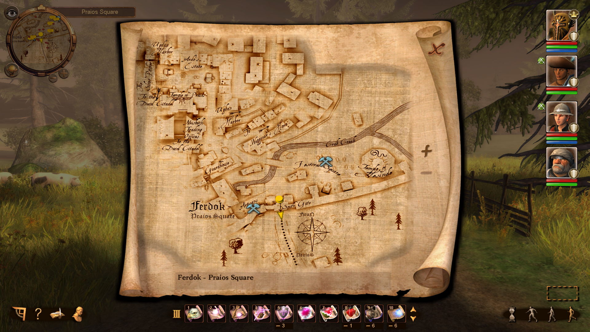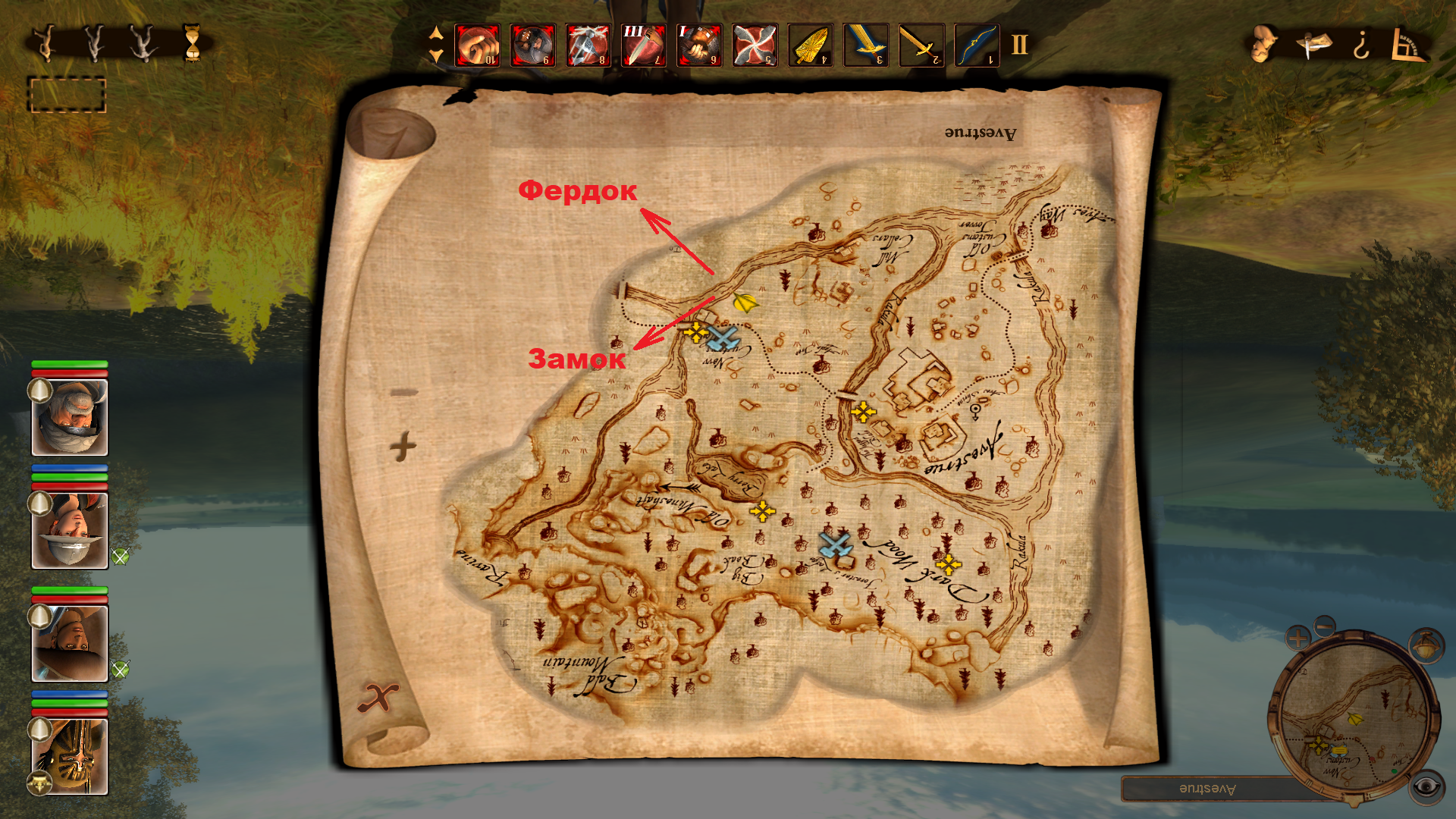 Кроме то судя по глобально же карте региона (на которой так же не обозначен север) Фердок от Авестроя располагается на северо западе, а на локальной же карте мы движемся в сторону Фейрдока, который видим же на горизонте, на юго запад (если предположить что север всё таки вверху). Однако если перевернуть локальную карту Авестроя вверх ногами то всё болей менее встаёт на твои места. Фердок оказывается на северо-западе, а безымянная крепость левее (или южней) от него.