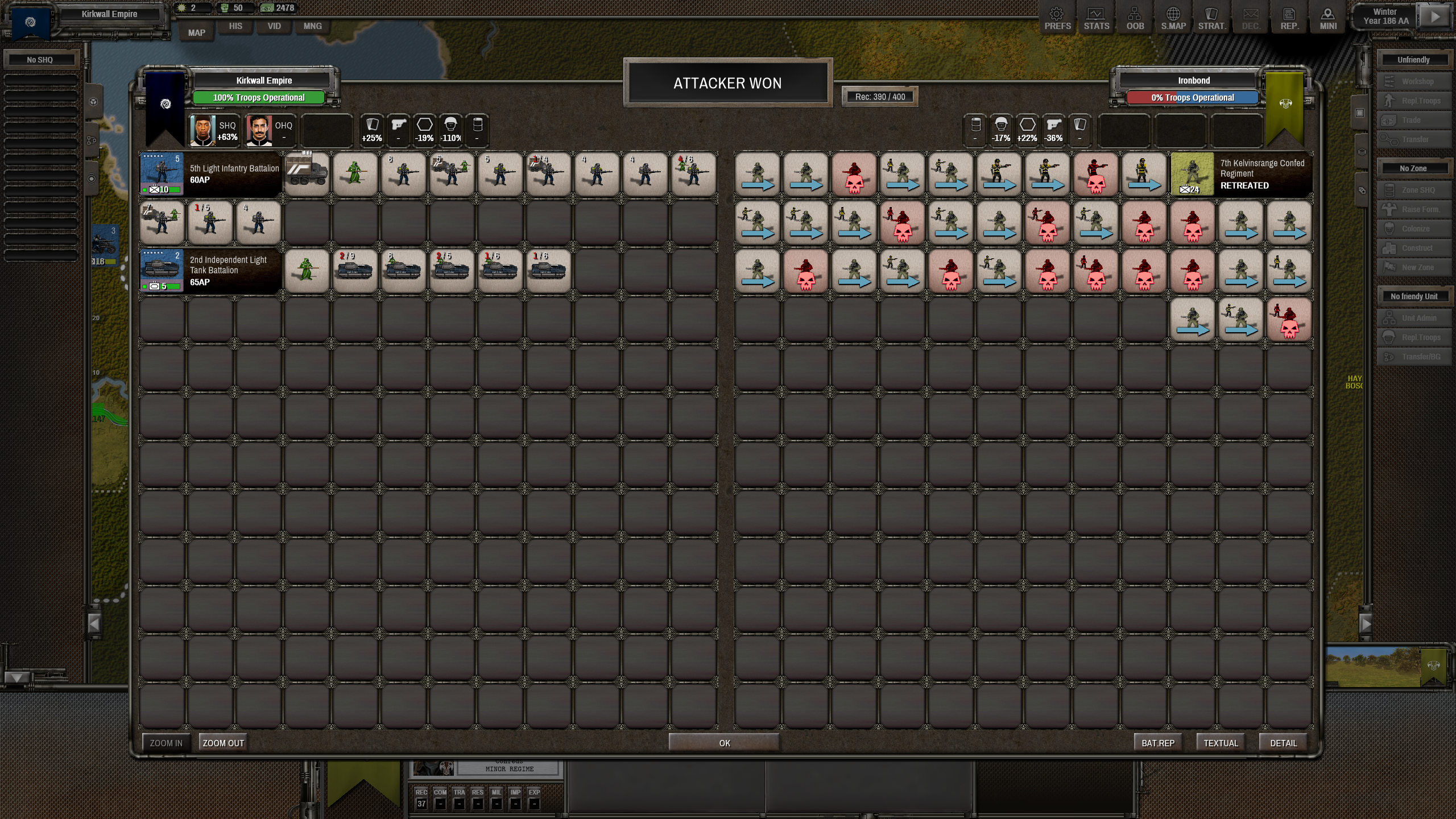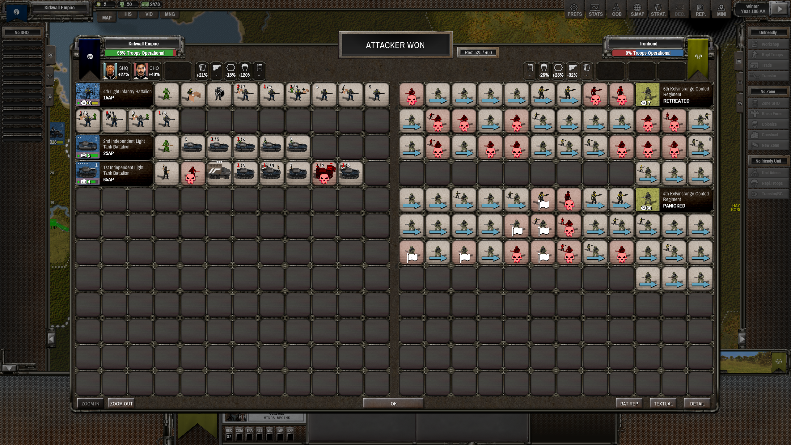 Стартанул на планеты с пиздецки хуевыми стартовыми ресурсами. Уже приготовившись клянчить цветмет, вдруг разведал каких-то лютых бичей живущих на руинах прошлой цивилизации. Пока тянул к ним дороги и строил логистические базы, успел навесить на свои юниты пару технологий, буквально пару. Но этого хватило, чтобы устроить ебаную резню этим оборванцам. Ни ожно пехотное подразделение не пострадало, хотя несколько танков они подбили.