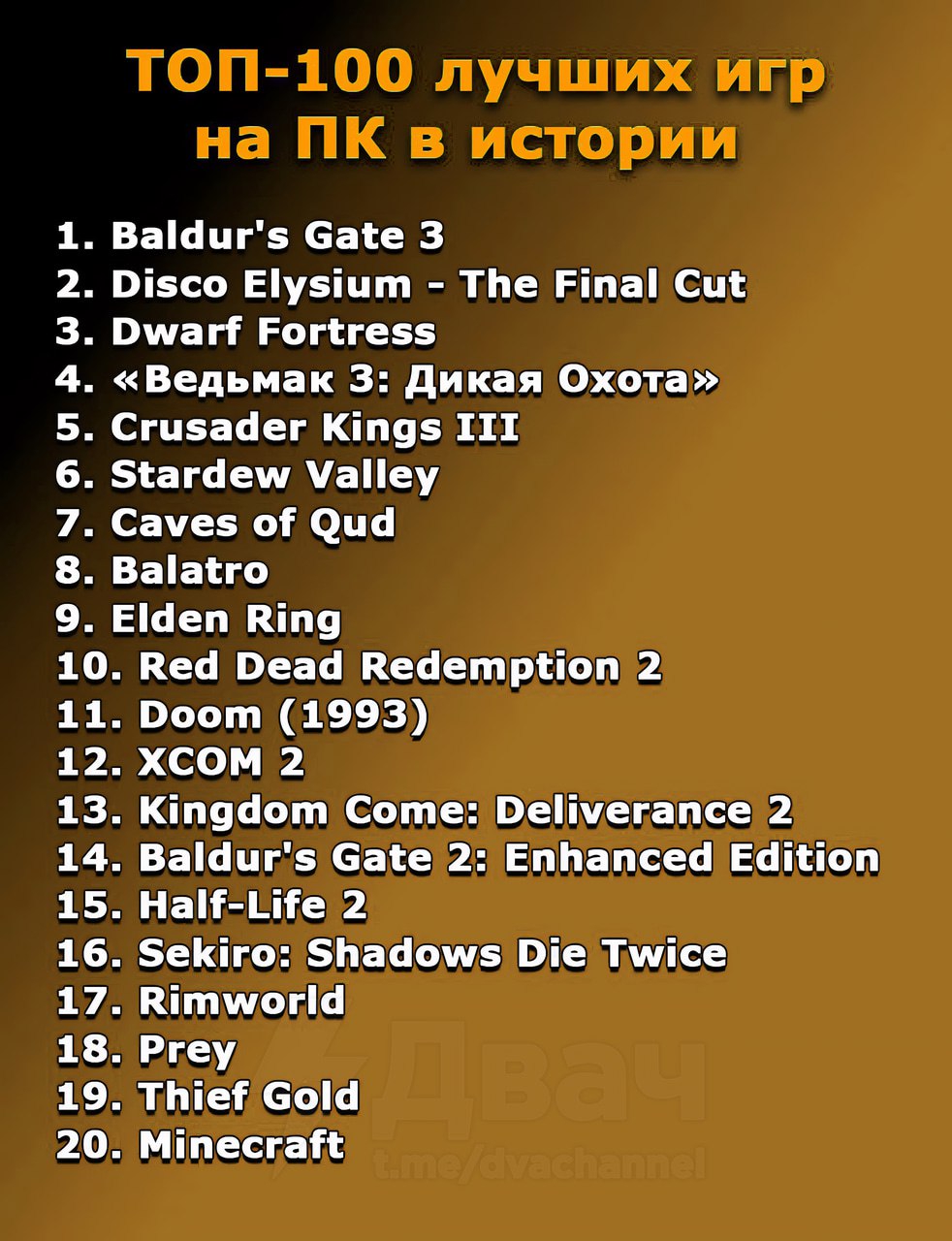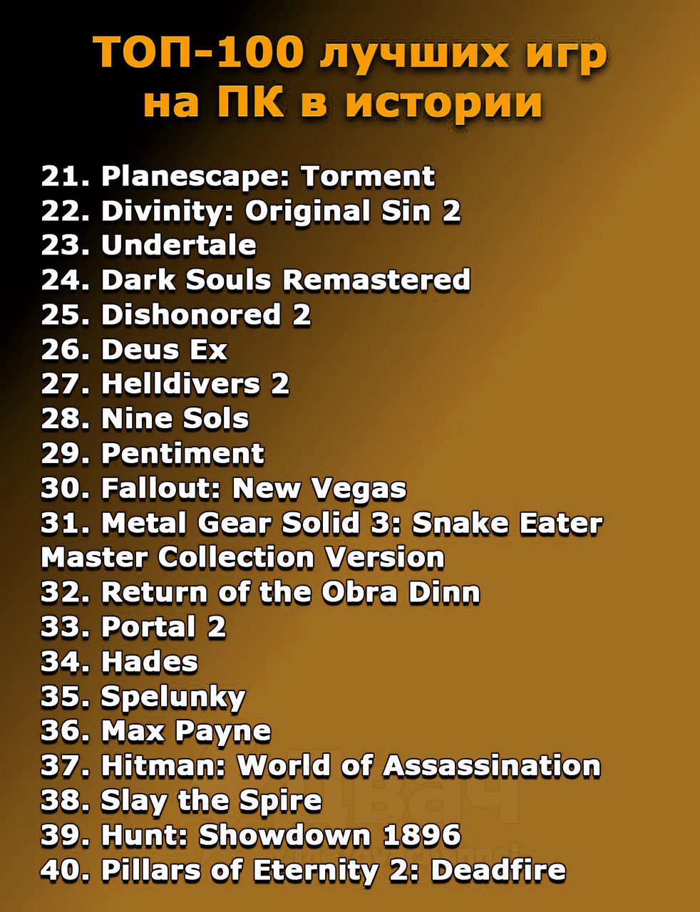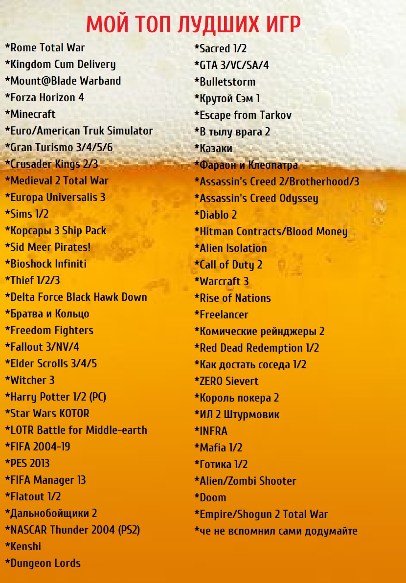 Ладно надо нормальный топ 100 делать для дебилов: 1. Minecraft 2. terraria 3. ftl 4. hunt showdown 1896 5. starcraft 2 6. team fortress 2 7. dead space 8. titanfall 2 9. diablo 2 10. half life 11. dota 2 и lol (дабы ознакомится с жанром moba) 12. xcom 2013 ребут 13. civilization 5 14. max payne 15. FlatOut 2 16. crash bandicoot n sane trilogy 17. vampire the masquerade 18. red alert 3 19. dragon age 20. left 4 dead 2 21. Fallout 2 22. Fallout new vegas 23. metal gear solid 24. thief 1/2 25. quake 26. quake champions 27. legacy of kain soul reaver 28. assassin's creed ezio collection 29. doom 1993 (с модом brutal doom) 30. doom 2016 31. dark souls 3 32. bloodborne 33. darkest dungeon 34. Super Mario Bros. 3 35. super mario galaxy 36. resident evil 2 remake 36. Ninja Gaiden ребут 37. dmc 3 38. metal gear rising 39. system shock 2 40. Homeworld Remastered Collection 41. far cry 3 42. Mirror’s Edge 43. hitman blood money 44. Star Wars Jedi Knight: Jedi Academy 45. rainbow six siege 46. swat 4 47. silent storm 48. Spider-Man ps4 49. Batman Arkham City 50. tes skyrim 51. total war shogun 2 52. portal 2 53. torchlight 2 54. Race Driver Grid 55. the vanishing of ethan carter 56. soma 57. dying light 58. limbo 59. castlevania symphony of the night 60. disco elysium 61. call of duty 4 62. red dead redemption 2 63. gta 5 64. resident evil 4 65. spec ops the line 66. tekken 3 67. mortal kombat 2011 68. for honor 69. mortal kombat версия для аркадных машин 70. super meat boy 71. hollow knight 72. marvel vs capcom 2 73. vagrant story 74. front mission 3 75. company of heroes 2 76. jagged alliance 2 77. hotline miami 78. risk of rain 2 79. Halo: The Master Chief Collection 80. Jet Set Radio 81. full throttle 82. battlefield bad company 2 83. battlefield 3 (ну так как онлайн сдох можно с трудом назвать 4) 84. f.e.a.r 85. supreme commander 86. crysis 2 87. undertale 88. prototype 89. silent hill 2 90. alien isolation 91. valkyria chronicles 92. stellaris 93. factorio 94. clive barker s jericho 95. binary domain 96. Street Fighter II 97. Super Mario Kart (любая часть) 98. Тетрис 99. Eve Online (единственная нормальная ммо, всё остальное кал для дегинратов) 100. Angry Birds