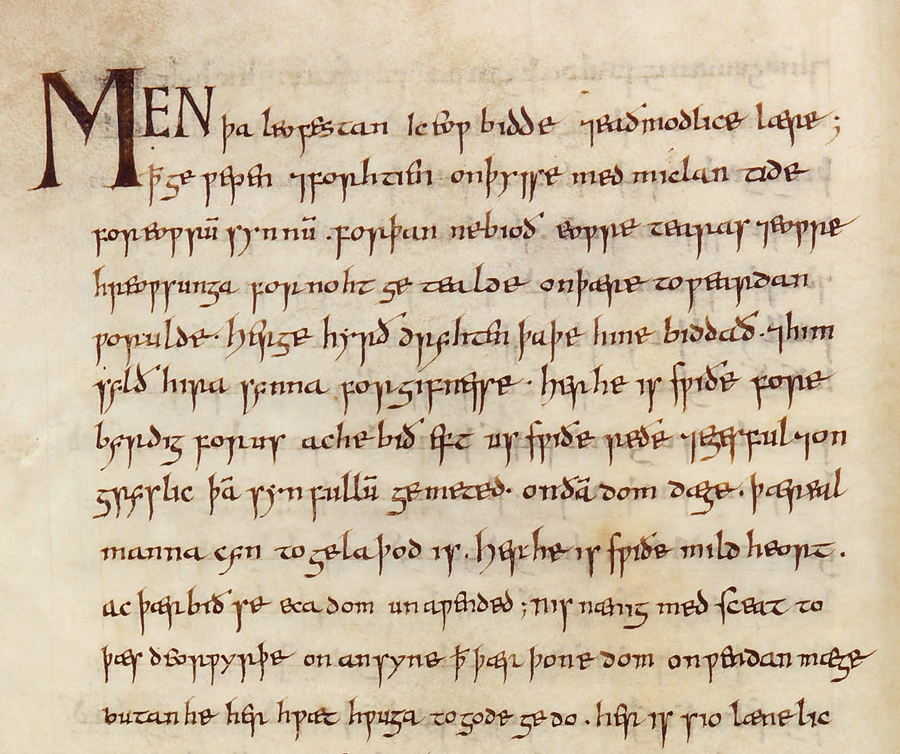 Fæder ure, þu þe eart on heofonum, si þin nama gehalgod. To becume þin rice, gewurþe ðin willa on eorvan swa swa on heofonum. Urne gedæghwamlican hlaf syle us todæg, and forgyf us ure gyltas swa swa we forgyfað urum gyltendum. And ne gelæd þu us on costnunge, ac alys us of yfele. Soþlice.