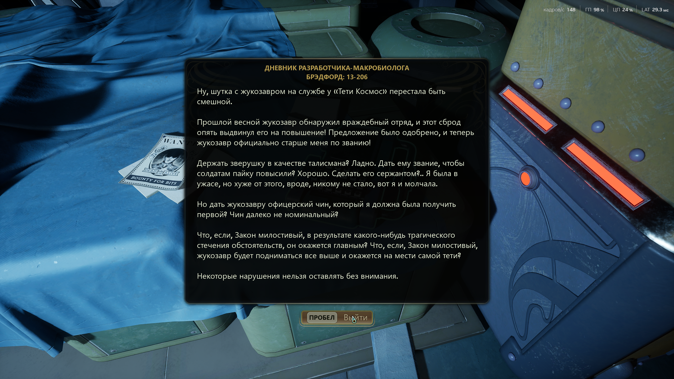 >>9886183 Насчет текста в терминалах полностью согласен,где-то 80% встреченного текста это что-то уровня,когда какой-то работник сделал небольшую ошибку и его подвергли наказнию в виде штрафа или лишения должности.И этот казалось бы неважный текст разбит на 2-3 сообщения и на 200-300 слов.На первой планете из необычного вспоминается только рассказ арбитра,который в прошлом был механиком и писанина Бриз.