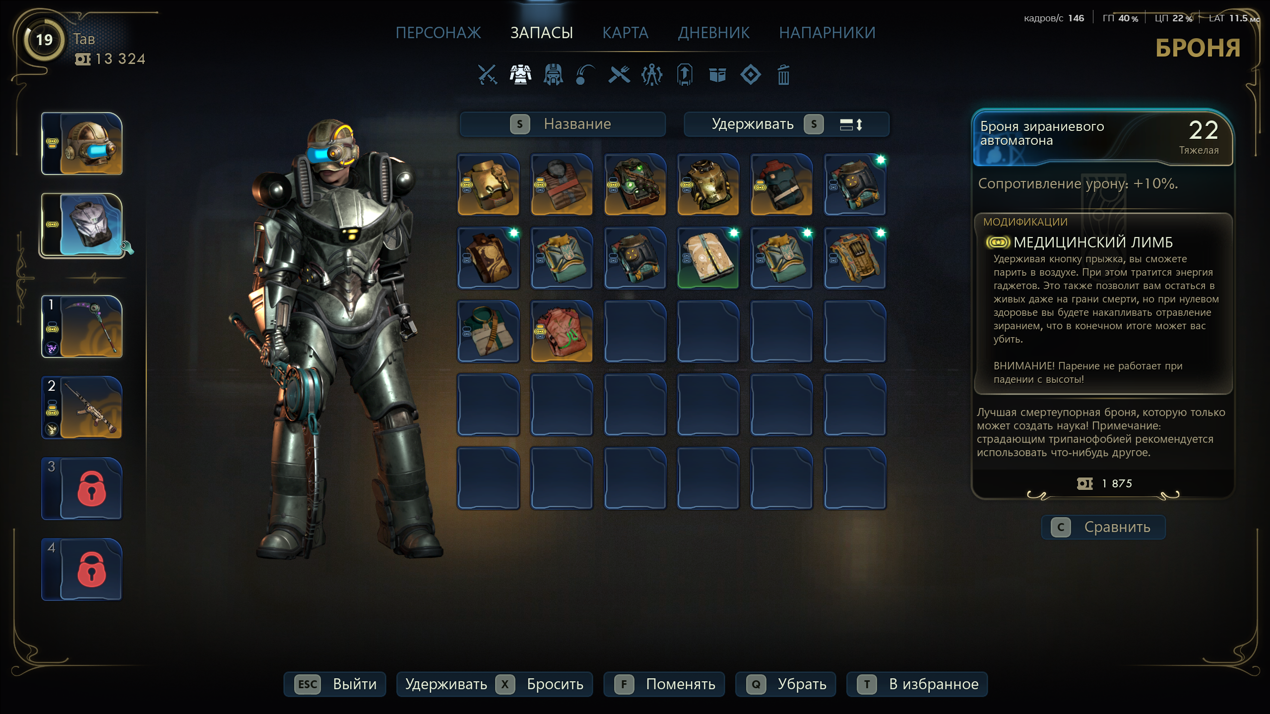 Казалось бы лучшая броня в игре, но способность ПАРИТЬ настолько конченно сделала в этой игре, ты просто можешь на 1 метр на землей парить, но это не дает тебе возможность перелететь куда то, ты просто падаешь