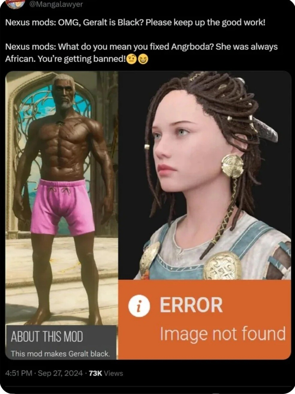>>9889638 Потому что моделька из раннего билда игры, где Абоба была белой в соответствие с мифологией, а не левацкой шизой, по перекрашиванию чужой культуры, лол. И это кстати не отменяет реальных кейсов, где удаляли подобные моды с нексуса.