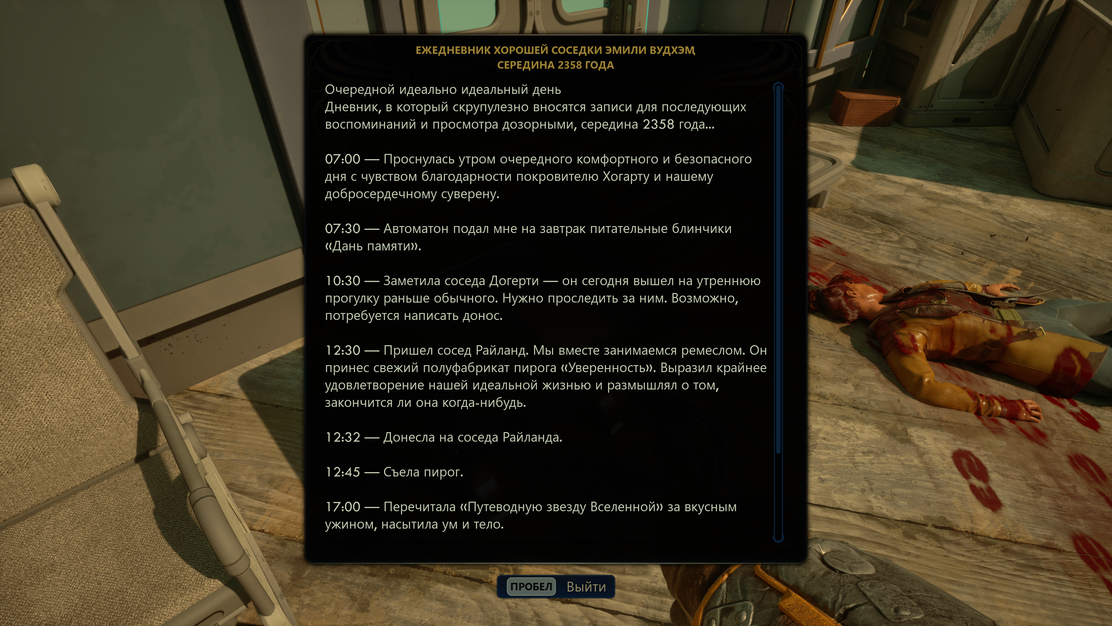 Вот что в игре действительно хорошо, так это юмор. Я что то орнул с истории про бабу из протектората которая совершила диверсию прыгнув с высотной платформы в шестерни механизма, чтобы двое корпоратов остались наверху и умерли с голода. Такая то борьба, такое то насаживание жопой на кактус во имя хуйских идей абстрактного величия. Причем двое оставшихся корпоратов вообще не знают, с чего эта дура решила совершить 50 метровый прыжок веры. Ну и высмеивание цензуры протектората с его новоязом, в частности с заменой слова "отступление" на "отрицательное наступление"