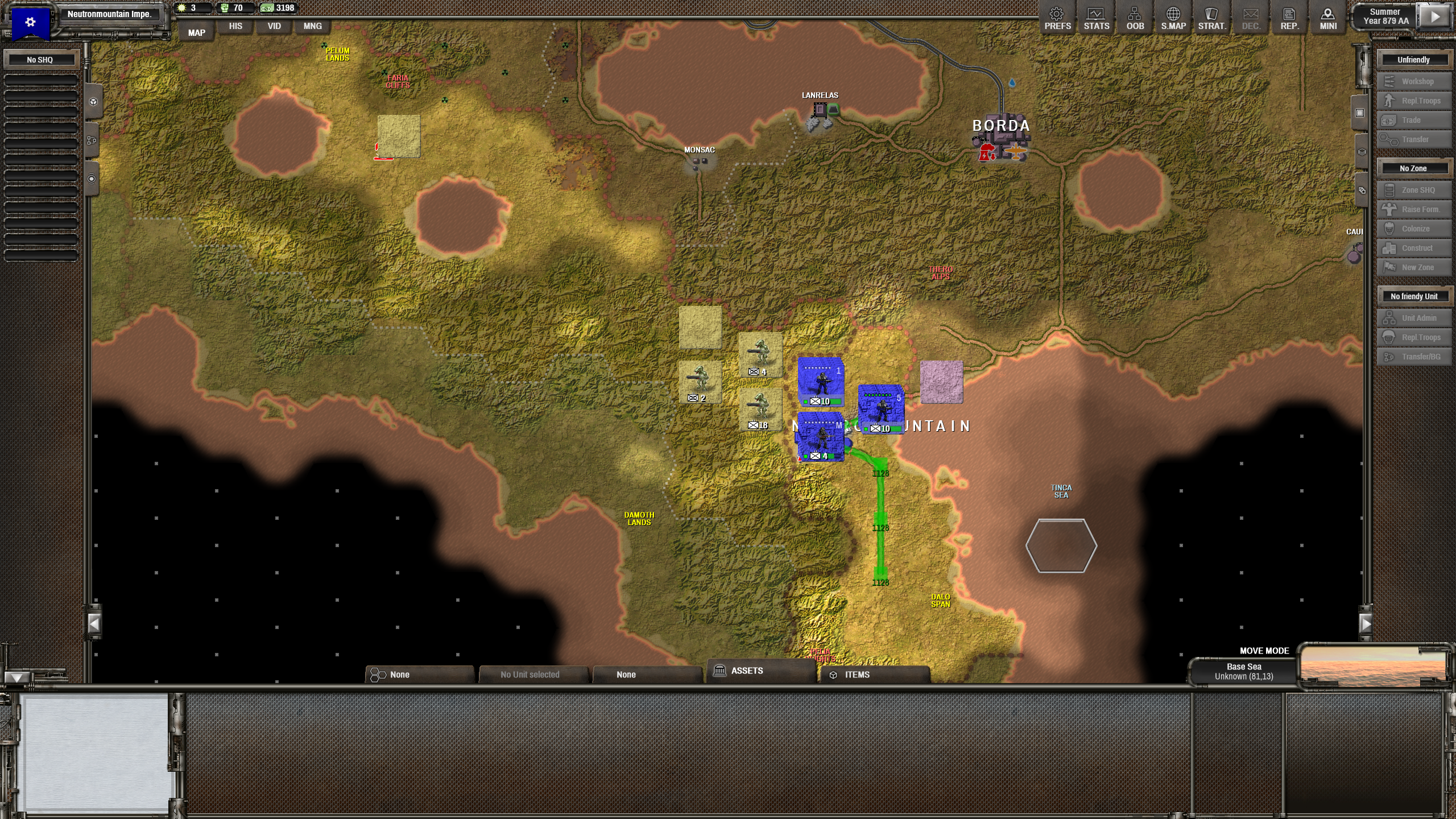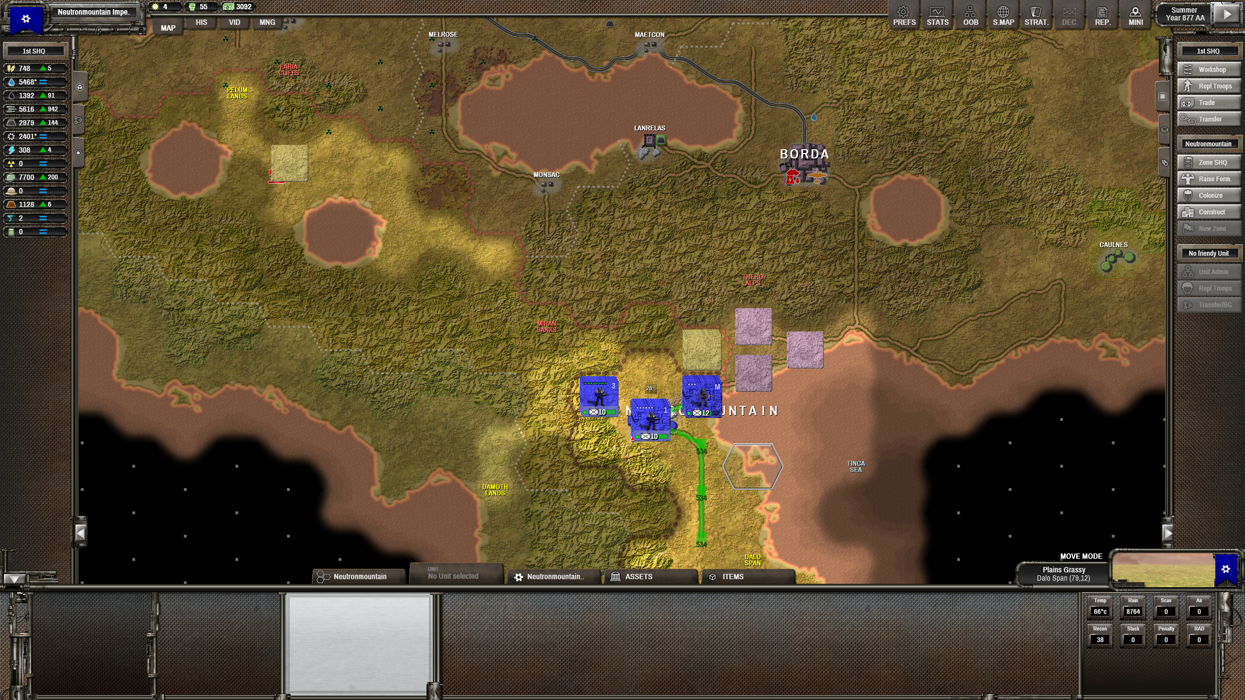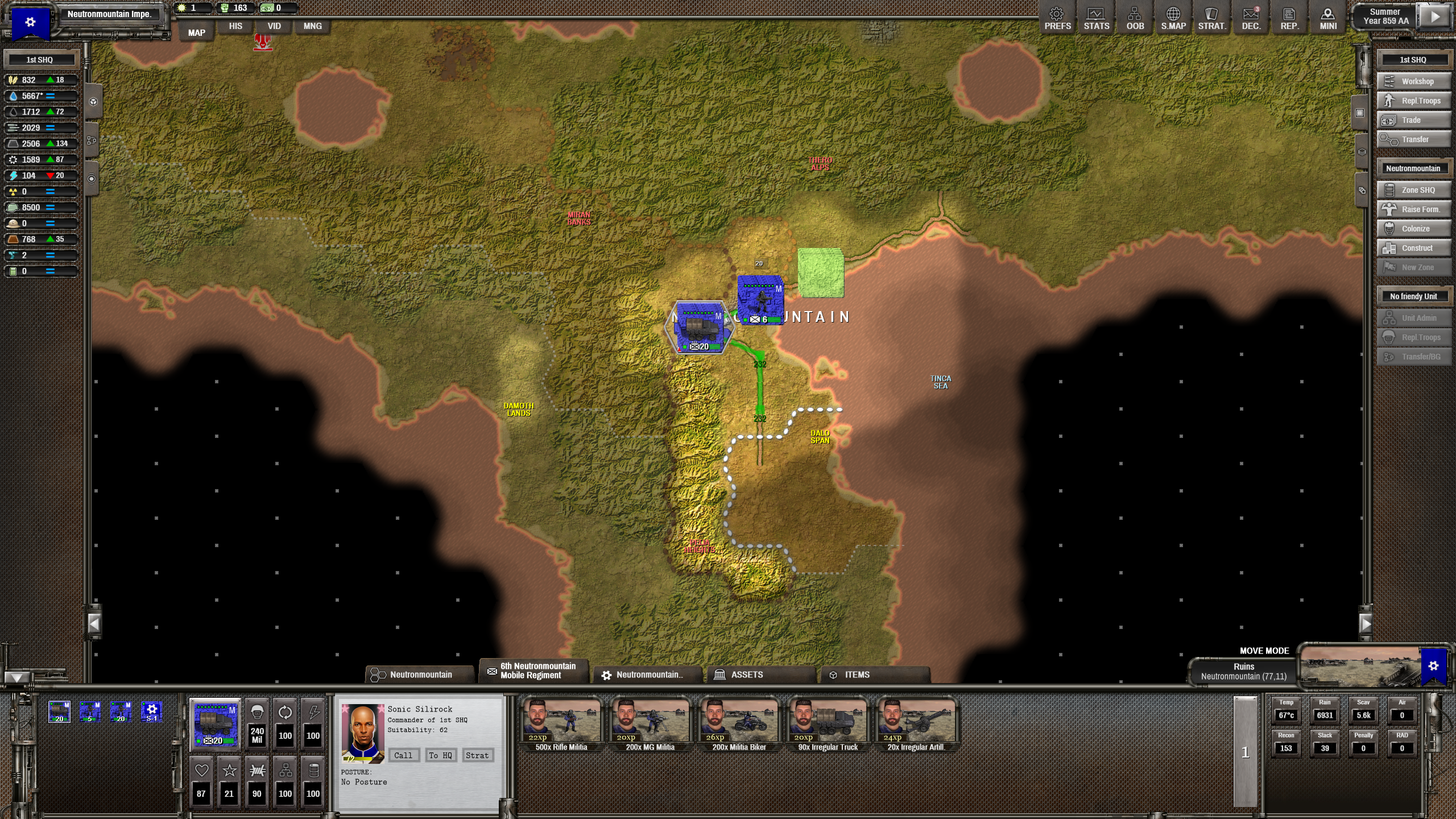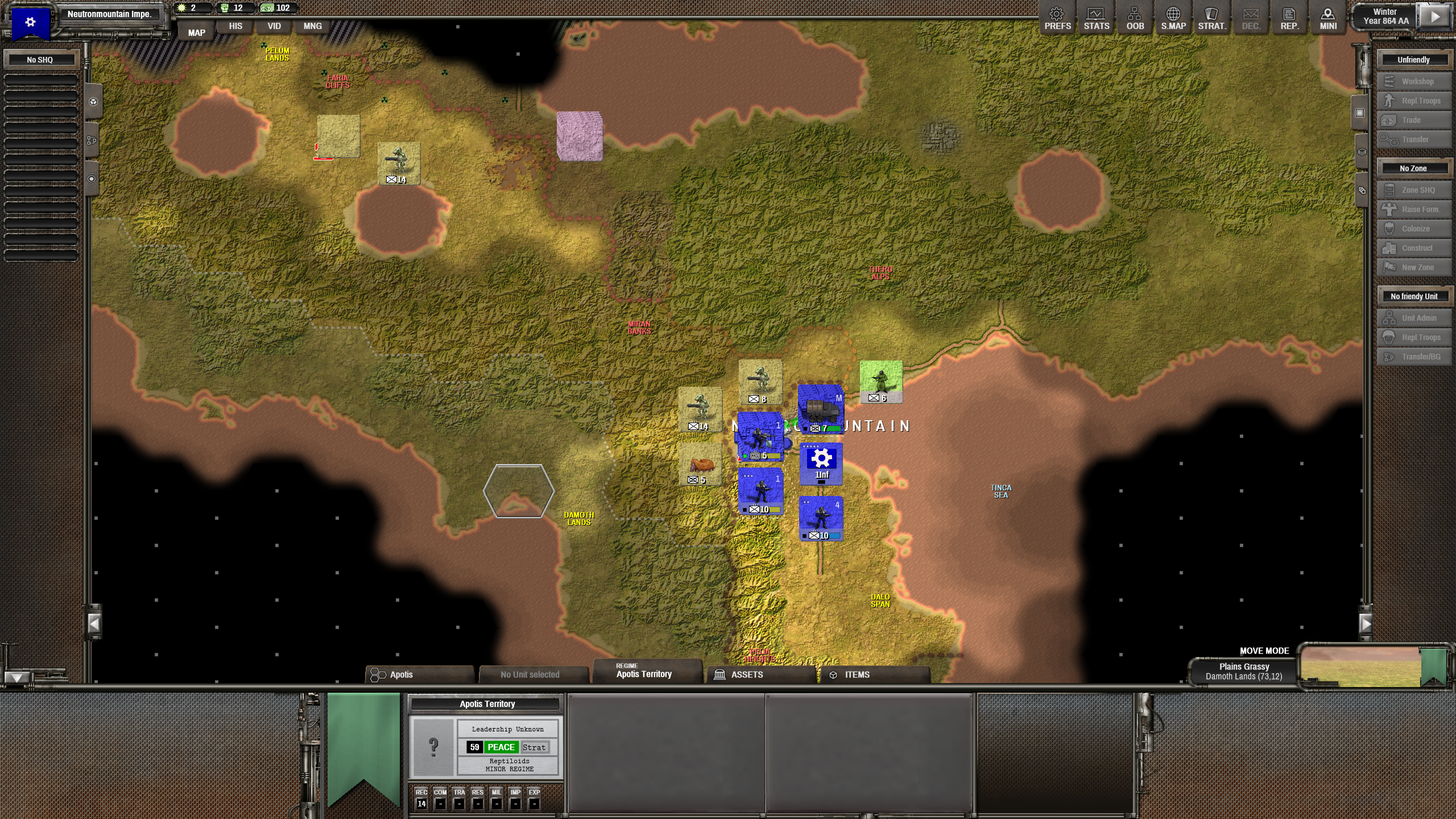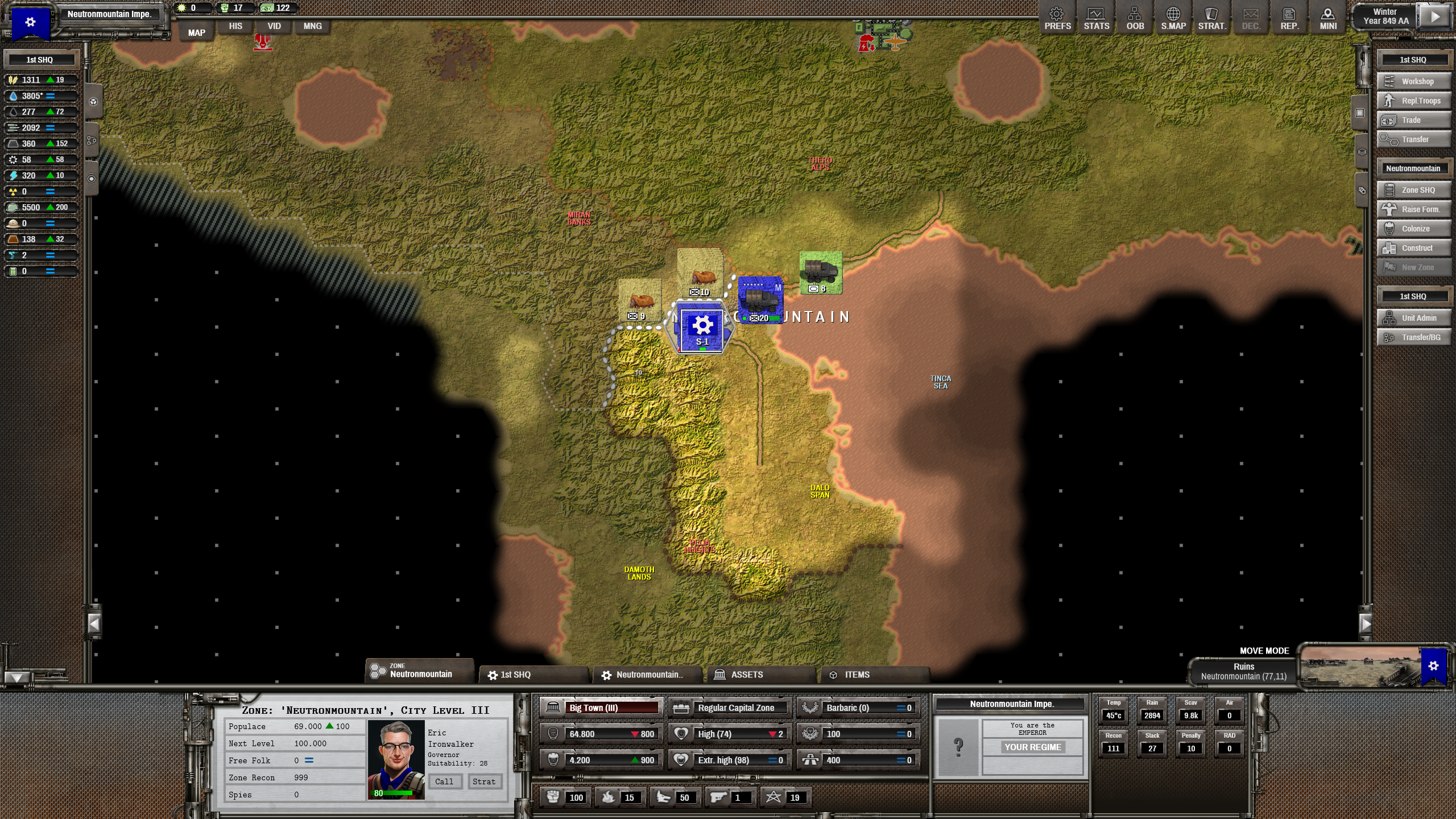 Мдааа... это самый лютый петушиный угол из все возможных. Как стартанул на двух клетках, так и сижу на них сотню ходов. С одной стороны щемят ксеносы, с другой - ебейше жирное государство, уже подогнавшее танки и артиллерию. Мы, правда, в горах, поэтому как-то выживаю. Не знаю, кстати, зачем: скоро все полезное, что можно наскрести в руинах, кончится, а ресурсов нет. В смысле, их вообще ноль. Впервые такое вижу. И все это в ебаных альпах, где без промышленности строить одну клетку дороги можно несколько ходов.