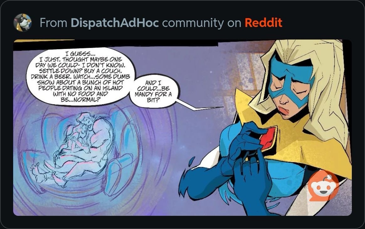 >А не набор скетчей 24/7, это утомляет и делает всё слишком не реалистичным Ну про это Трекстар говорит прямым текстом - топим отчаяние в шутках, когда надо-то и Диспатч серьезную мину скорчить может.