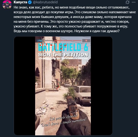 >>9891269 В игре нет ничего правового или левого, просто за годы обработки протыками воюющими в культурной войне гоймеры охуели что ОКАЗЫВАЕТСЯ в игре могут быть просто история и персонажи с их взаимоотношениями, а не попытка продвинуть политический месседж, поэтому у радикальных леваков бсод от того что там не говорят о небинарности, а правачки пытаются выдать игру за детище своих БАЗОВИЧКОВ не имеющих к игре никакого отношения, разработчики вон нормально сотрудничают с левачками из критикал ролла.