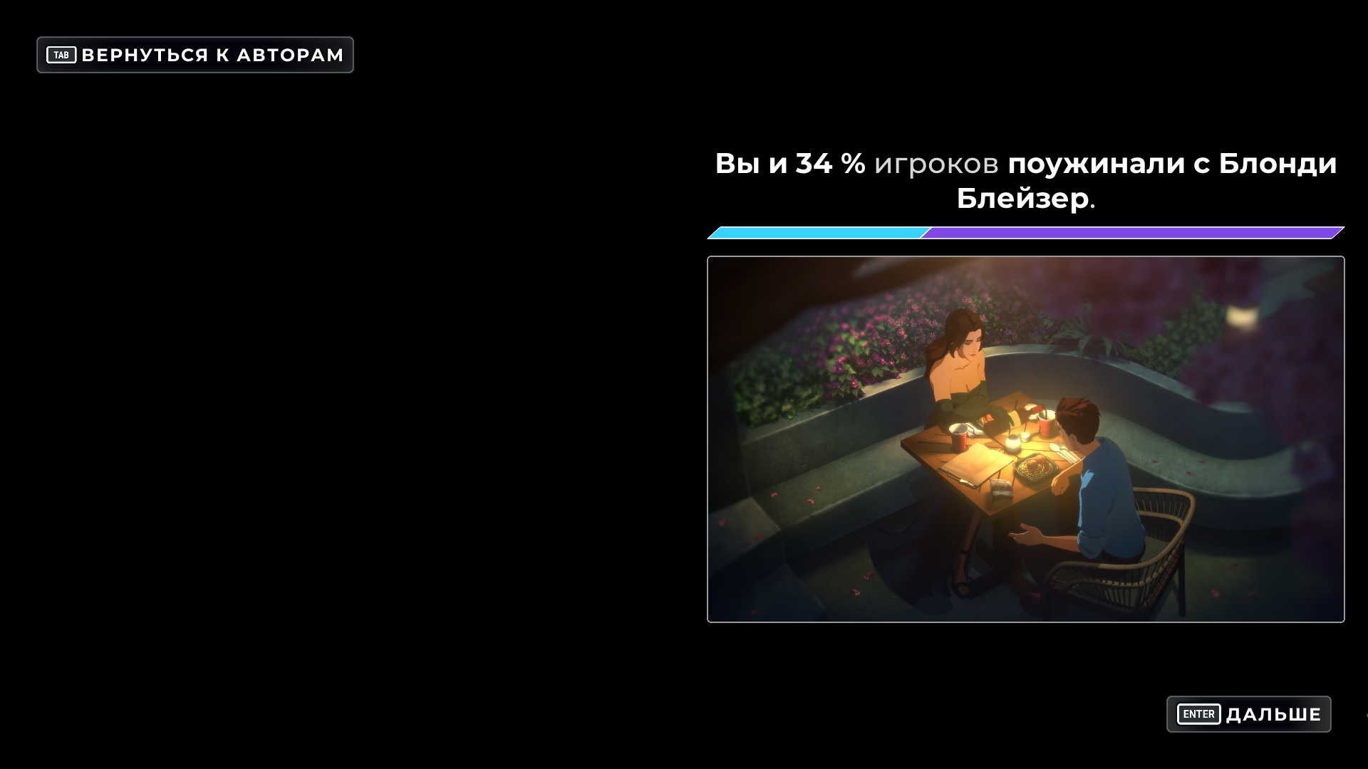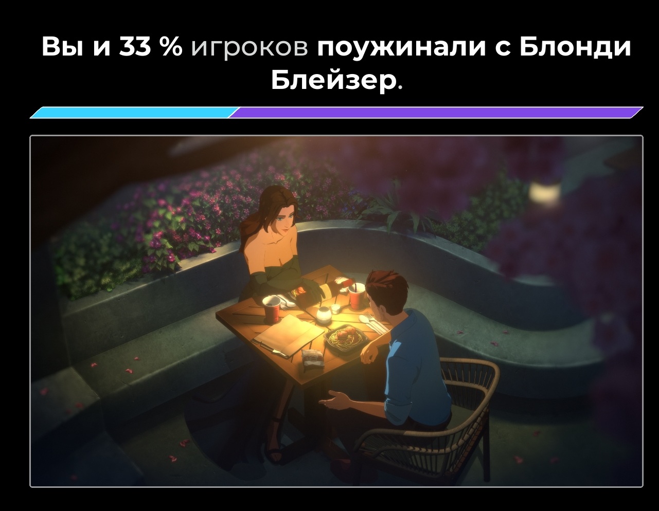 Ебать все выбирают пиздючку. Эво как. А вообще чую в следующих эпизодах гг кинет тян кого бы он не выбрал. Рельсы, рельсы. А ещё ощущение что статистика в конце никак не берет данные других игроков, а нарисована разработчиками заранее от балды