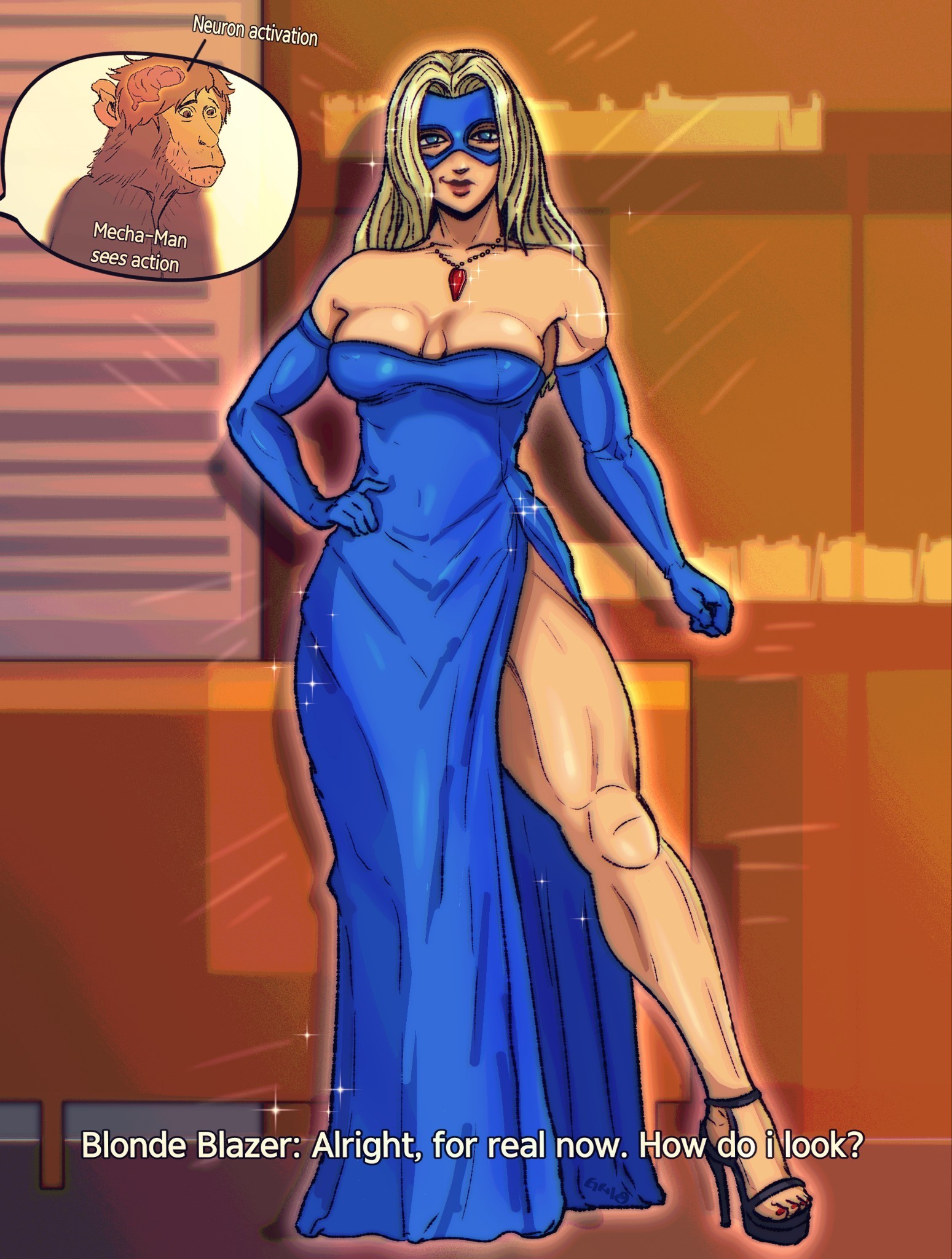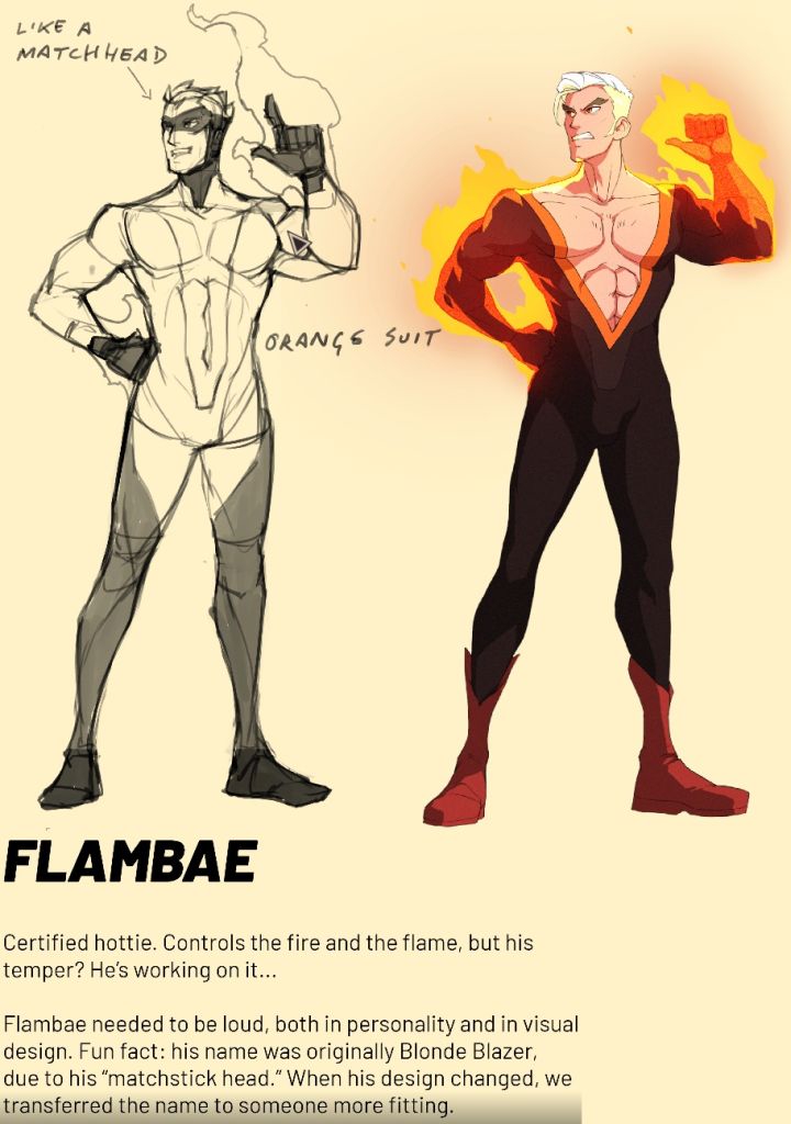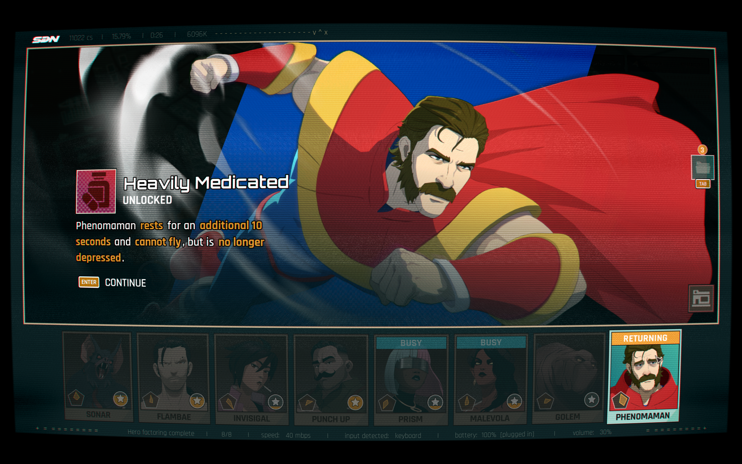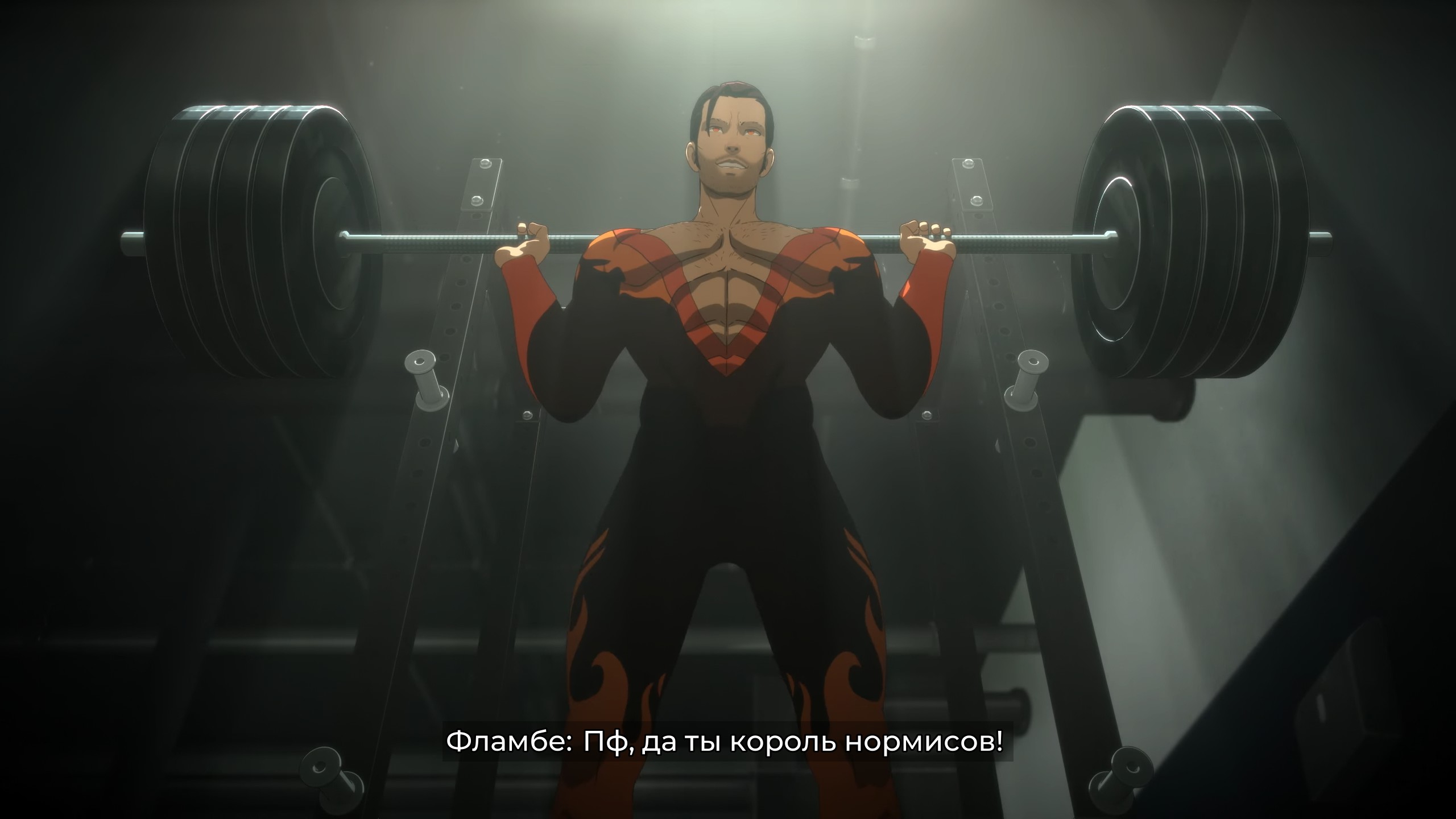 Понять бы ещё реальный уровень сил суперов. В команде супер говнюков все +- среднего уровня или чуть ниже, Фламбе крепкий средняк по статам на начало игры. При этом он довольно бодро накидывал Мехамену, который определённо герой топ тира. Сужу по реакции злодеев, после раскрытия своей личности. Усач так вообще топ 1 герой SDN, но статы у него не прям запредельные.