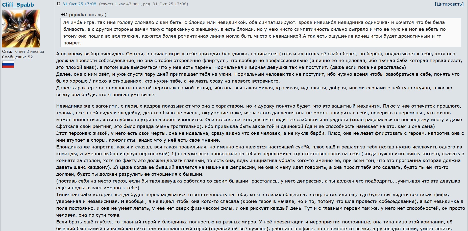 Вот казалось бы, 2025 год на дворе, на дваче людям в среднем по 25, а то и 30 лет, а споры про вайфу не делись никуда. Никто ж навязать выбор не может, чё вы усираетесь вообще? Лучше бы фанфики с тройничком писали