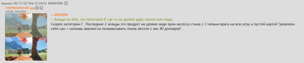 Наверное самое переоцененное гавнище в истории. Одноклеточная хуйня для зажиточных соевых мириканцев со стекающей слюной. Забавно как наши каргокультисты подхватили эту тему МЫ ТОКИЕЖЕ МЫ ЛЮБИМ ЗЕЛЬДУ КАК И ВЫ.