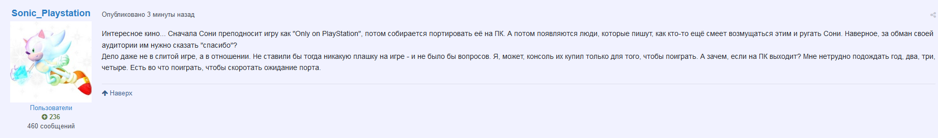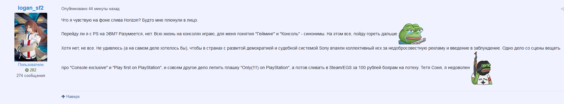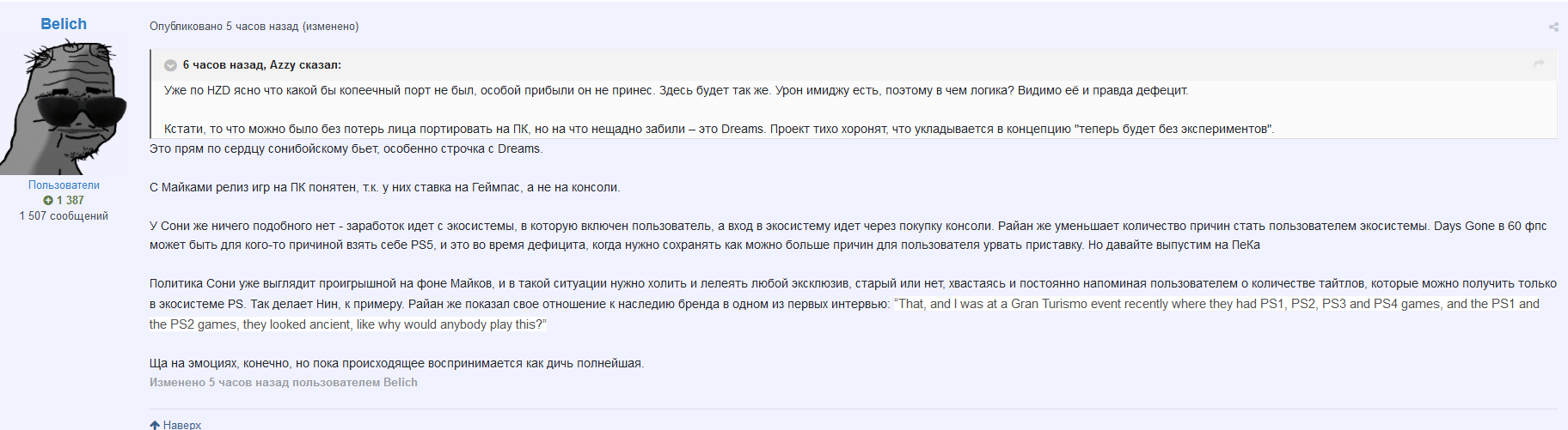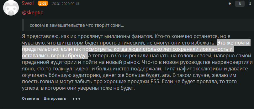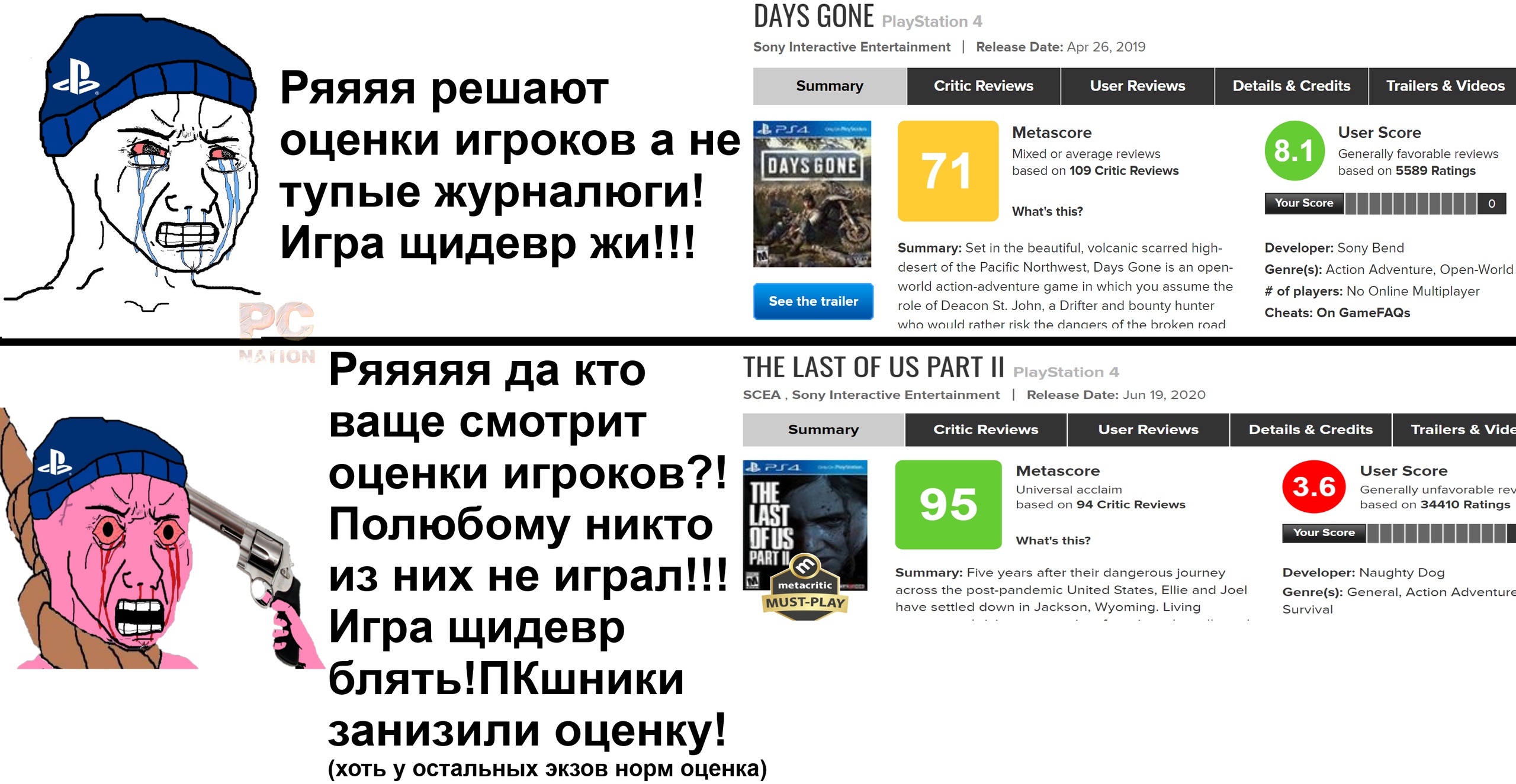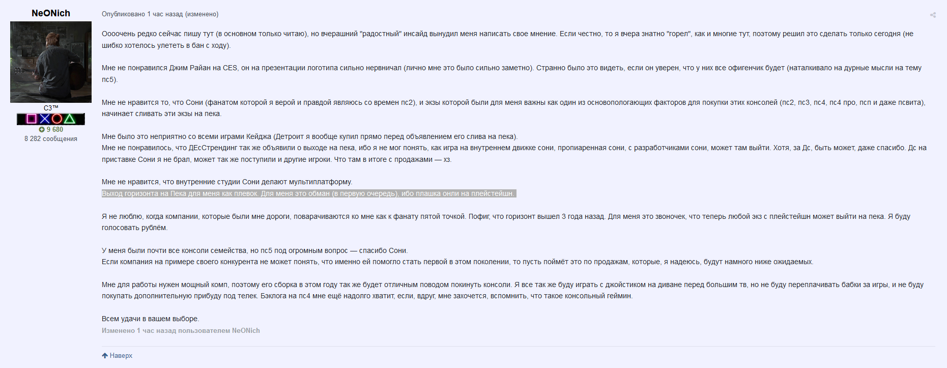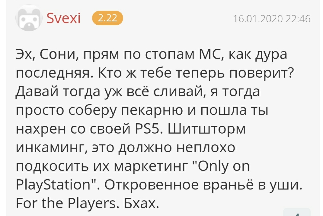 Визжит относительно небольшая группа лиц, остальным похую. Они как играли на мыловарне, так и продолжают, потому что привыкли. А эти визжат потому, что им продали не консоль и игрульки, им продали эксклюзивность. Причищение к кругу избранных, семье игроков Сони, не таких как все, для которых выпускают лучшие и самые удобные продукты. Им похуй на игры, им важно вот это самое чувство. Оно абсурдно звучит, конечно, но есть додики, которым именно так вещи и продают. А у них это чувство отобрали разом, лол. Теперь они самые обычные долбоёбы, которых развели маркетолухи на покупку коробки и оверпрайс игор с хуёвыми онлайн-сервисами. Вот от этого становится очень НЕПРИЯТНО.