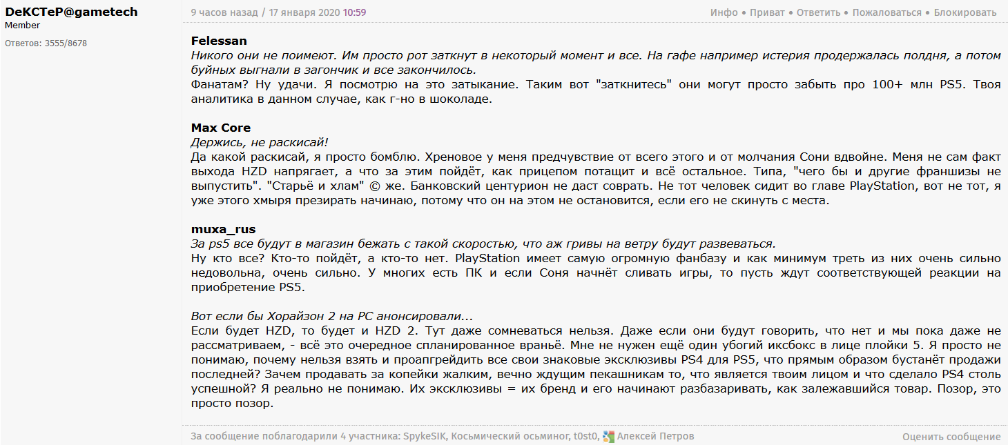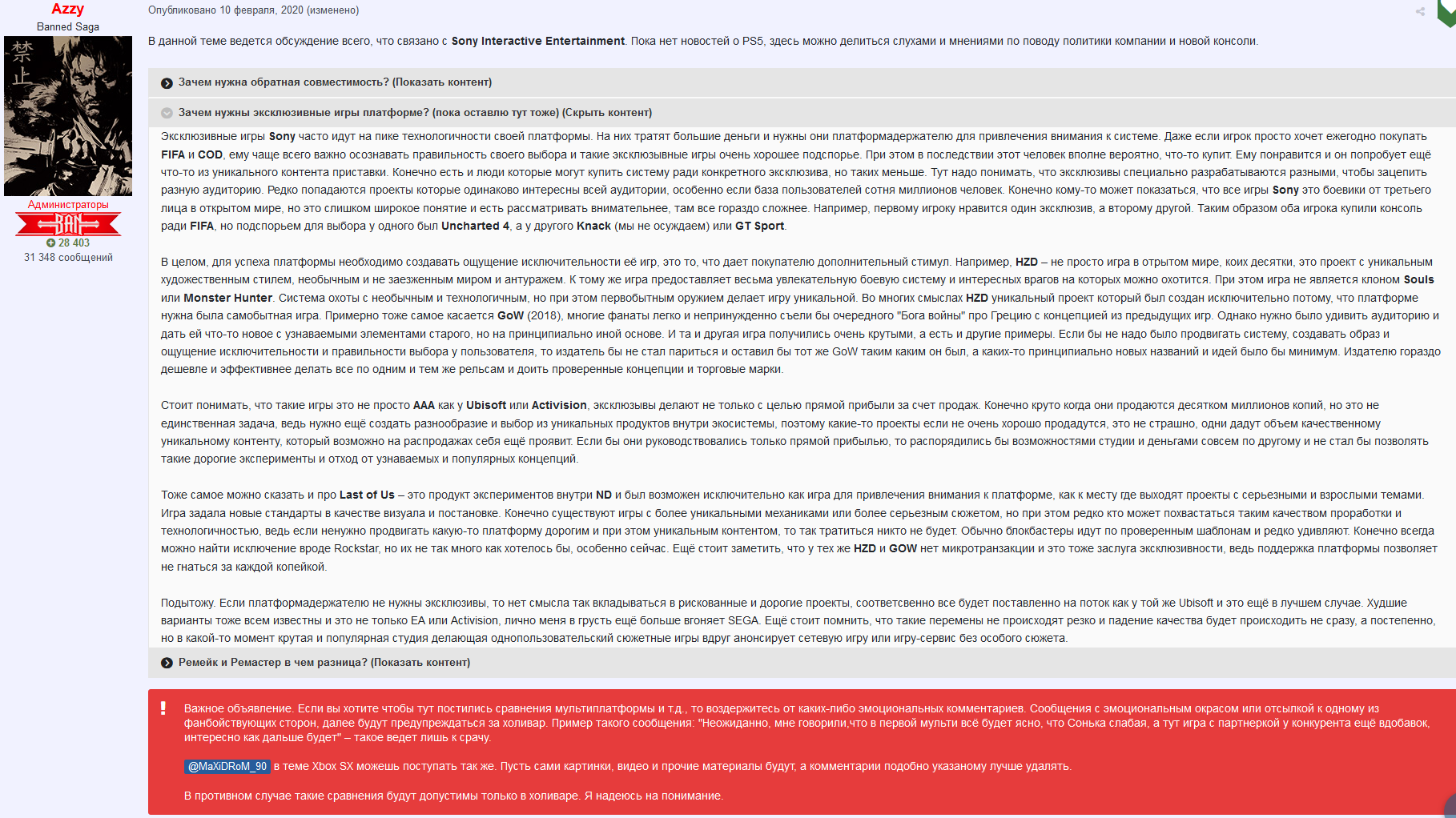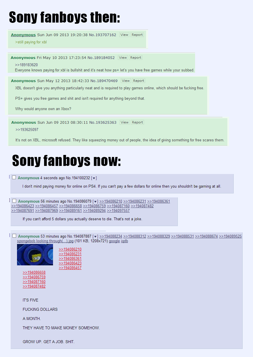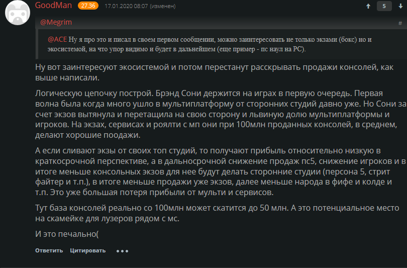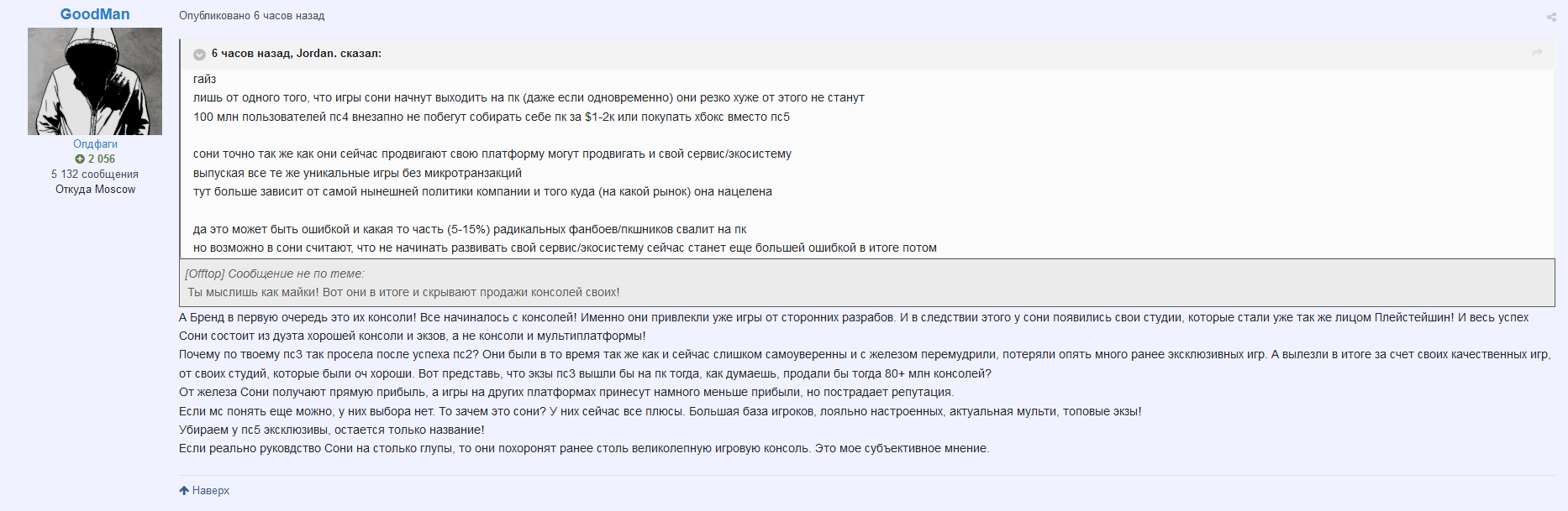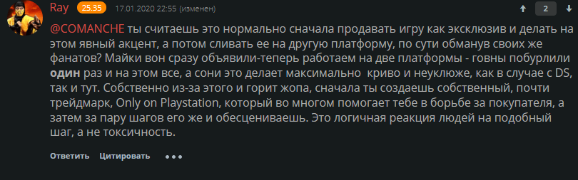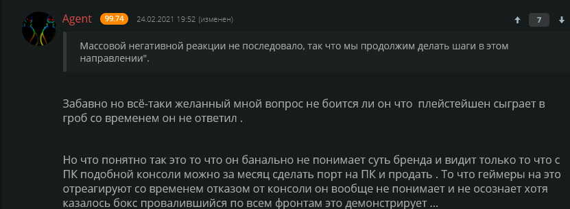 Визжит относительно небольшая группа лиц, остальным похую. Они как играли на мыловарне, так и продолжают, потому что привыкли. А эти визжат потому, что им продали не консоль и игрульки, им продали эксклюзивность. Причищение к кругу избранных, семье игроков Сони, не таких как все, для которых выпускают лучшие и самые удобные продукты. Им похуй на игры, им важно вот это самое чувство. Оно абсурдно звучит, конечно, но есть додики, которым именно так вещи и продают. А у них это чувство отобрали разом, лол. Теперь они самые обычные долбоёбы, которых развели маркетолухи на покупку коробки и оверпрайс игор с хуёвыми онлайн-сервисами. Вот от этого становится очень НЕПРИЯТНО.