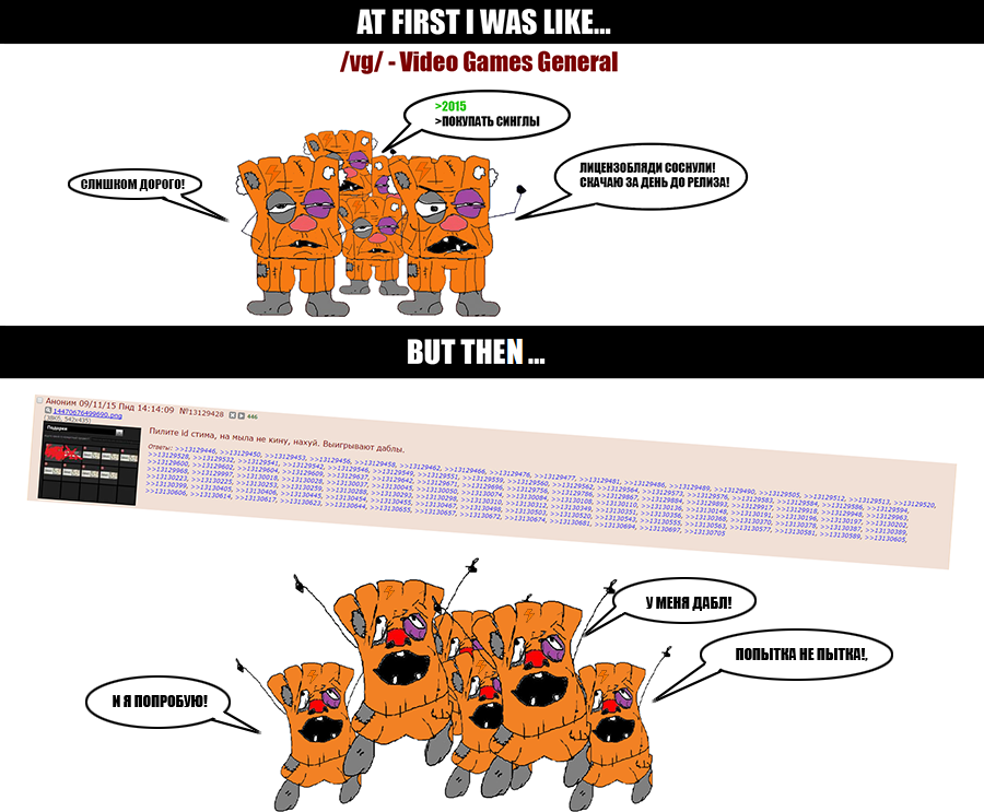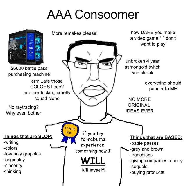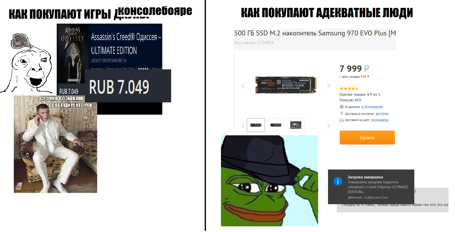 Короче оформлю положняк по треду. Со второй половины нулевых(xb360/ps3) игровая индустрия по сути стала массовым развлечением на равне с музычкой и кинцом. В хобби, где задроты сидели у себя в подвале и гамали на консоли или пк, вкатилось дохуя быдла, которое потребляет любой кал на похуй. Ну так вот, пока вы быдланы будете финансировать и массово закупать всякое говно по типу продукт игросодержаший, идентичный натуральному, мы можем играть в него бесплатно, потому что вы лошары уже все оплатили. Такова ваша участь, терпите.