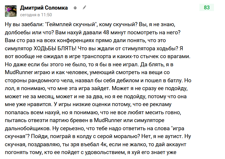 >>9871449 >Когда бабу тащил через снега - это целый отдельный эпизод борьбы с природой и отдыхом на горячем источнике. В мультиплеере же пидорасы протянули канатную дорогу что через горы можно перелететь за 30 секунд вообще земли не касаясь. Повезло с сервером, у меня до этого момента тоже все было построено и я тупо рашил по прямой через бандитов, говно, ебак, небо и алаха, не обращая на них внимания, наслаждаясь шизокинцом и не душась об всратейший гейплей с гринданом ресов и ебучей стройкой. Только благодаря этому дошел до снегов, где уже нихуя не было, включая байк, и пришлось тащиться пешем самому. Один раз я еще сходил спотыкаясь, но когда блеадь они второй раз заставили туда сюда переться, то дропнул эту хениальную парашу и первый раз допрошел игру на ютубе. Надо будет завезти вторую часть поиграть на трубе, с гейплейной точки зрения такого говнища даже в ранние 90е не делали, а у вас щас это артхаусная йоба за 10 тыщ лол.
