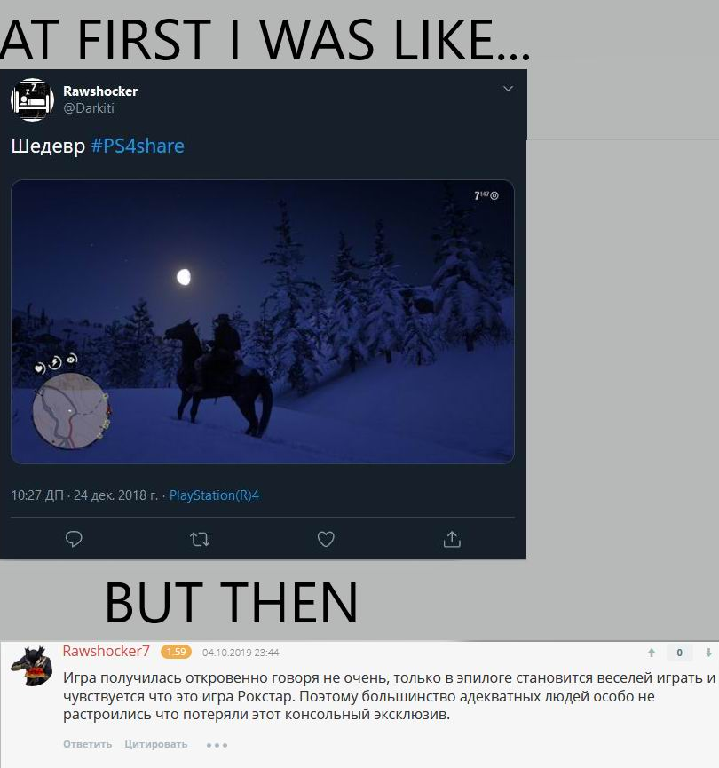 >>9860824 Смешнее всего было когда они включали режим РАЦИОНАЛИЗАЦИИ ПОСЛЕ ПОКУПКИ. Пытались всех вокруг (но в основном себя) убедить что отлично играется, что потанцевал еще не раскрыт, что к гейпаду надо просто привыкнуть и тд. Орейро конечно знатное.