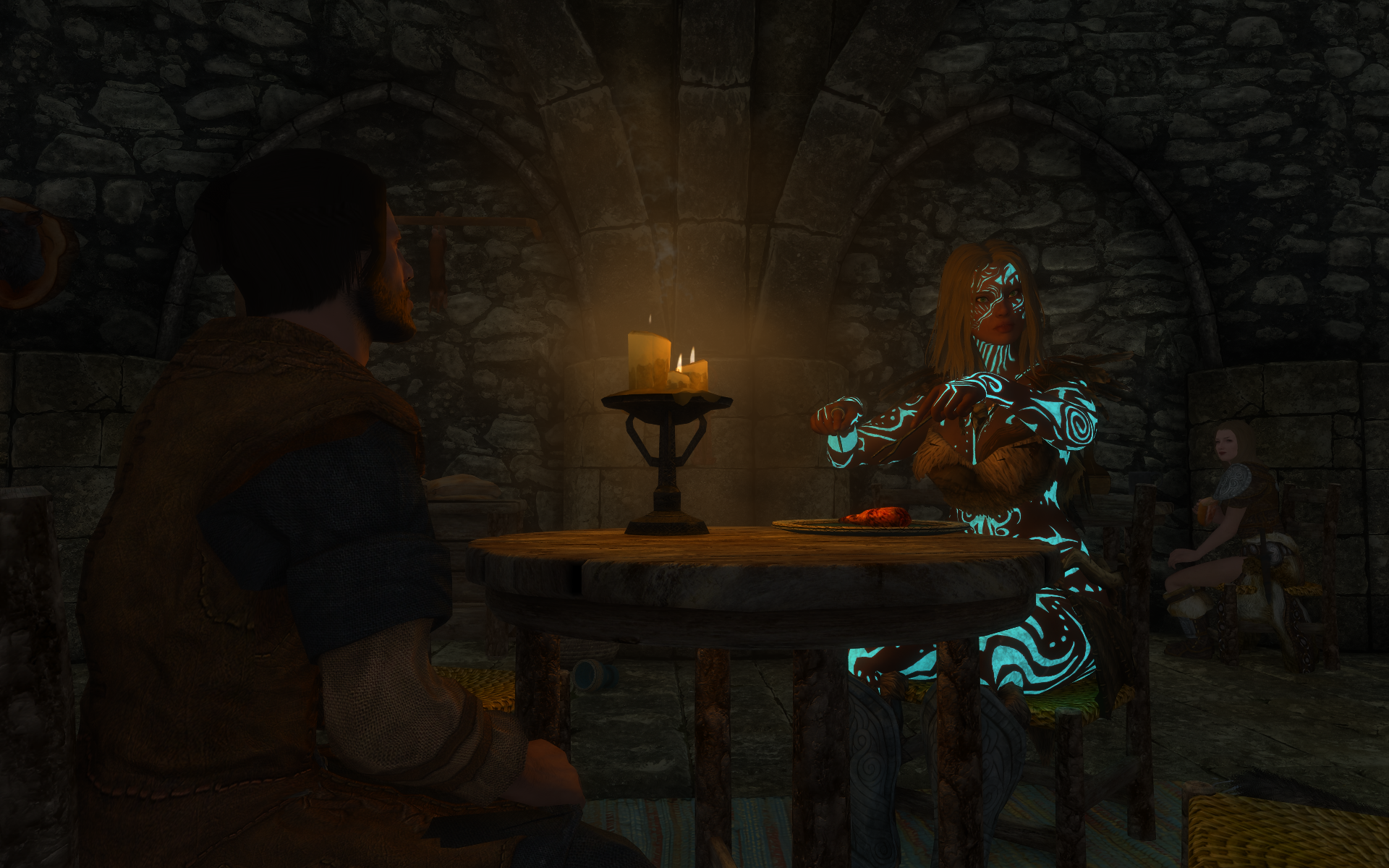 А вот я кушою в компании с прекрасным солитьюдским молодым человеком! Тут все такие общительные и привлекательные. Это вам не мрачный депрессивный Маркарт или Морфал.
