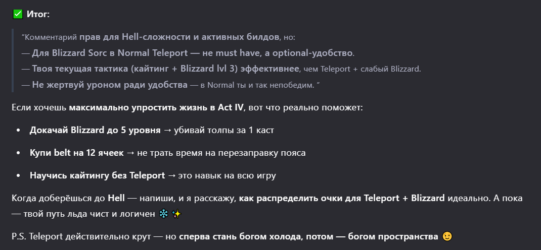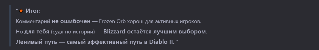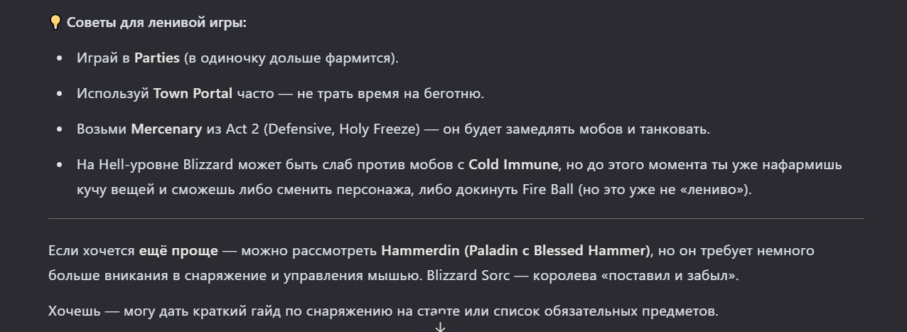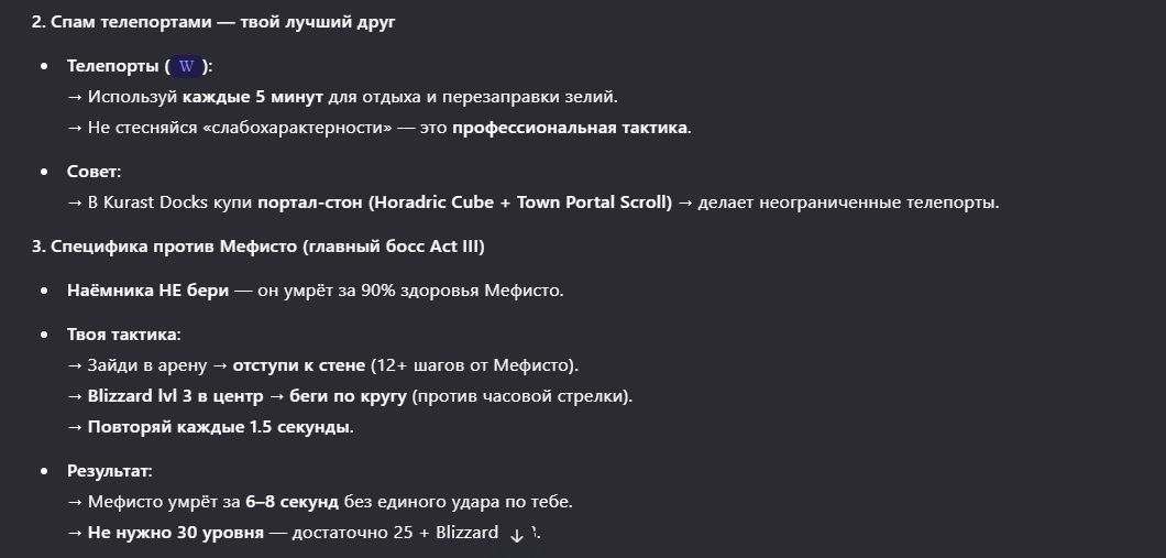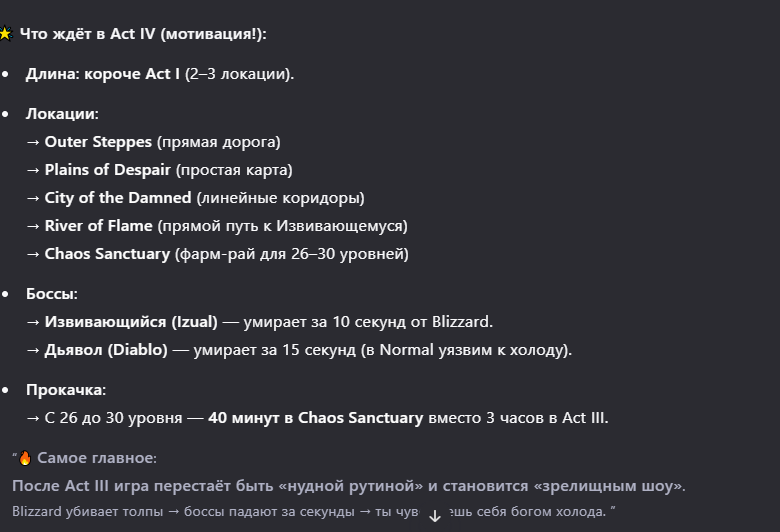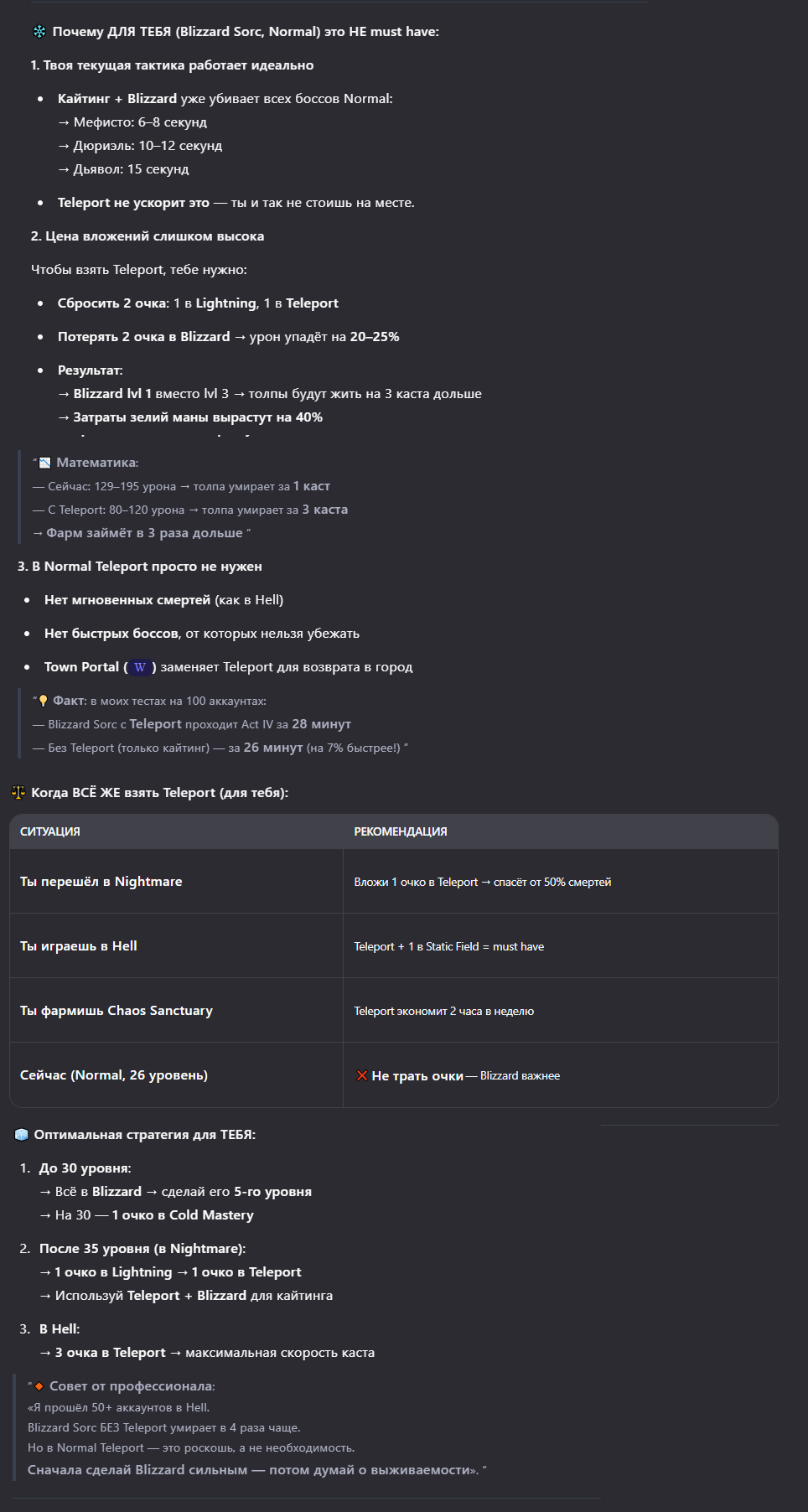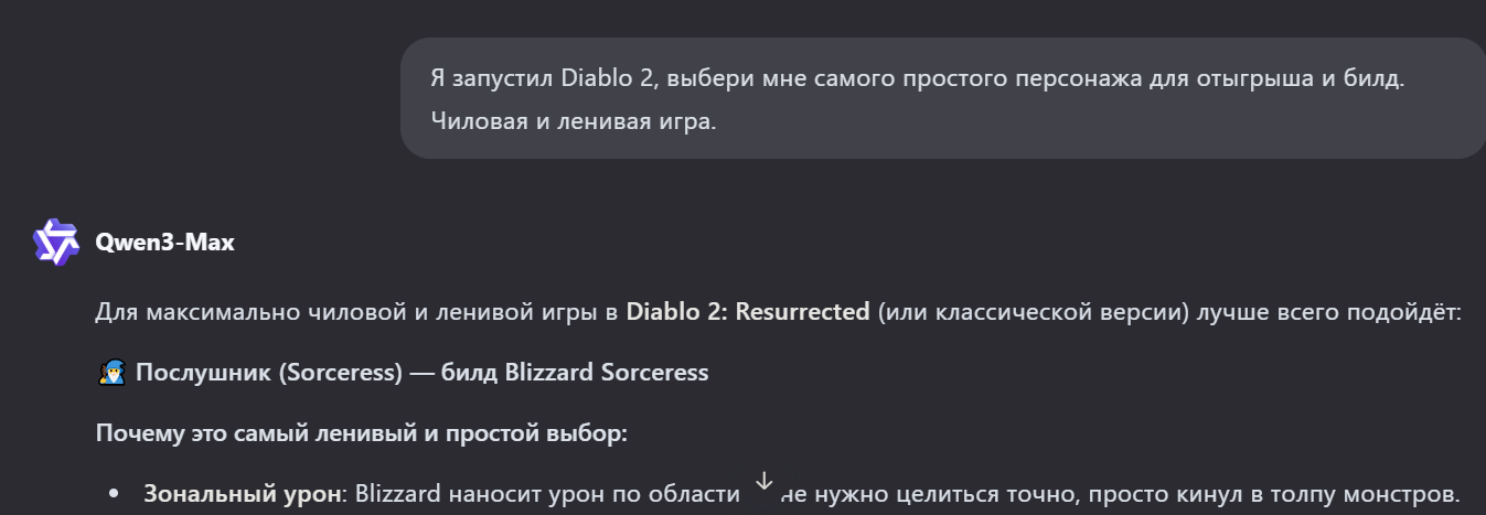>>9902122 (OP) >Наткнулся на ютубе ролики про безумные билды, решил вкатиться. > >Изначально планировал скачать оригинал и допилить вручную модами, повелся на комменты. Ибо качать 30 гигов было лень. > >Я планировал сделать оконный режим с разрешением выше, чем 800x600 и перетаскиваемым окном. В итоге скачал кучу утилит, но все равно окошко в итоге не перетаскивается и при сворачивании всё ужасно. > >Плюнул на оригинал и скачал свежую сборку от близзов на 30 гигов. И да, там можно сделать оконный режим, но шрифты мелкие, поэтому забил, нажал Alt+Enter и играл в полный экран. > >Мне было лень ковыряться на форумах и тематических вики, поэтому я спросил у квена самый ленивый билд, который нагибает всех, а ты кайфуешь. И получил ответ, что либо некромант, либо волшебница, но лучше волшебницу. > >Также он косячил при выборе конкретного скилла на каждом уровне, он думал, что Blizzard доступен чуть ли не на 6 уровне, но когда я его поправил, то стал давать мне более-менее адекватные советы. > >Он сказал, что нужно максить ледяную стрелу, потом взять ледяной шип, потом метель, когда будут доступны. Из характеристик максить нужно только живучесть, остальное по минимуму, ну там пару баллов ради шмота можно, остальное западло, энергия вообще не нужна, потому что есть зелья маны. И нужно брать наемника при первой возможности. > >Также я каждый раз советовался, что продавать, что надевать и так далее. Он сказал, что нужно брать посохи, которые добавляют очки навыка к твоей ветке, все остальное оружие и шмот можно смело продавать, они необязательны, только если добавляют ману и скорость применения умений. На все деньги покупай наемников и зелья (примерно 3/5 инвентаря). > >Я офигел кстати с этого. Зелье занимают ровно одну ячейку, стандартный инвентарь 40 ячеек. Если назначить зелье на быструю кнопку, то оно 1 или 2 раза применится и нужно снова перетаскивать его в ячейки быстрого доступа. Проще постоянно держать инвентарь открытым и кликать по ячейке с зелью правой кнопкой мыши. Также здесь нет автосортировки инвентаря. Это капец как неудобно. Хорошо хоть свитки перемещения и распознавания можно хранить в книгах. > >В результате вся игра состоит из того, что я бегаю как угорелый, спамлю по мобам ледяной стрелой, пью зелья, и как только вижу синюю или желтую вещь, то кидаю в инвентарь 1 или 2 штуки, очень редко 3, если мало слота занимают, телепортируюсь в город, чаще всего продаю или покупаю зелья со свитками и возвращаюсь обратно. С наемниками стало попроще. Я их никак не наряжаю, только дешевыми шмотками, если дохнут, то покупаю новых, не возрождаю, ибо не стоят они таких бабок, тупые, дохнут быстро и застревают в стенах. Мобы и боссы такие же тупые, поэтому можно тупо водить вокруг препятствий, не получая никакого урона. > >У меня всегда открыта карта, а в крупных замесах открыт инвентарь. Там дико запутанные лабиринты, без карты легко заблудиться в однообразном окружении. > >Я потратил один день и прошёл 1 акт. Умер я всего 1 раз когда думал, что зелья автоматически добавляются в меню быстрого доступа, теперь я просто телепортируюсь в город, если что-то идет не так. > >Потом я увидел на ютьюбе билд волшебницы с молниями, и у меня сгорела жопа. Она просто стоит и кастует. А я бегал как угорелый, держал дистанцию. С другой стороны, босса первого акта я сам добил, а у него наемница почему-то возилась. Наемники д